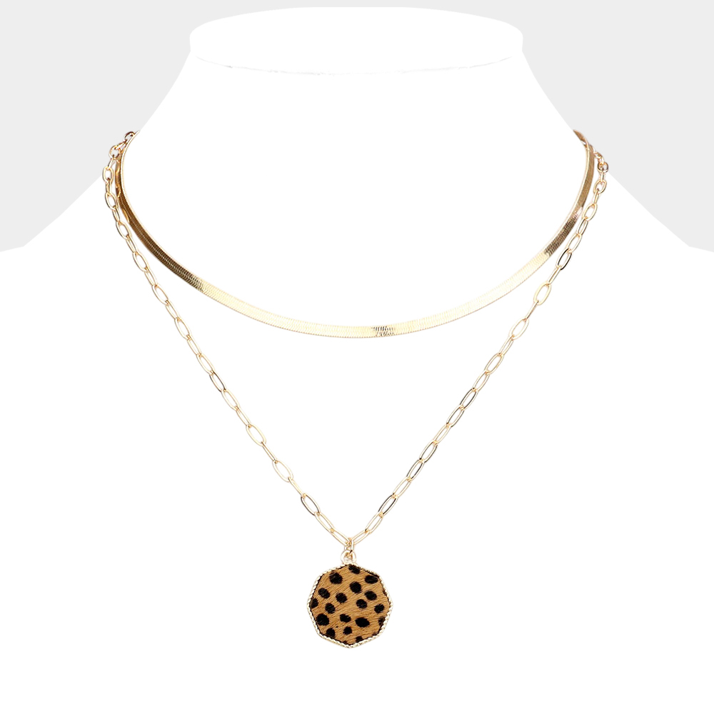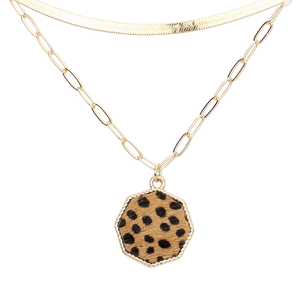 Cheetah Patterned Genuine Leather Octagon Pendant Double Layered Necklace