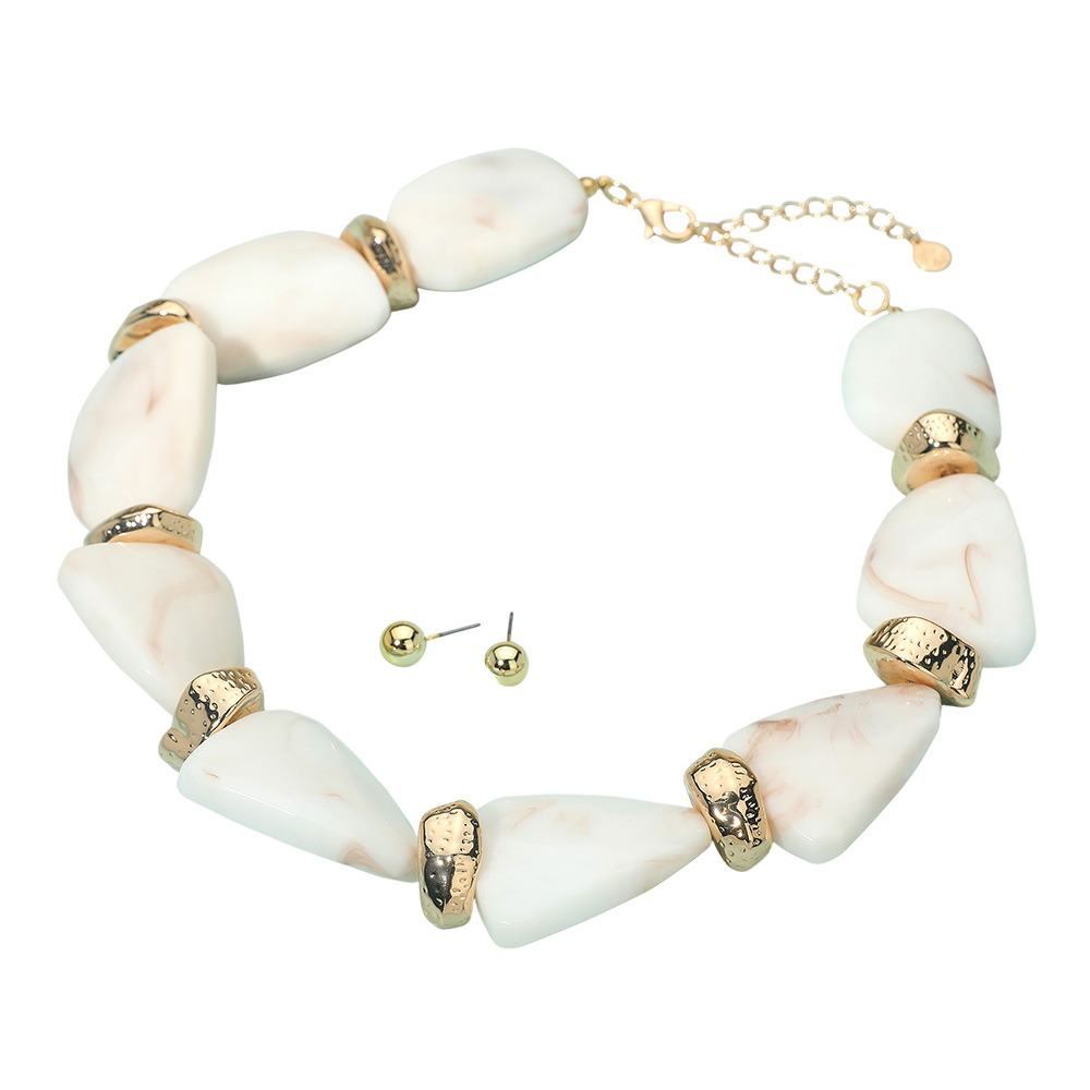 Details • Necklace Size : 17" + 3.25" L • Decor Size : 1.2" L • Earrings Size : 0.25" L • Make a striking impression with a chunky stone necklace set featuring oversized natural-shaped beads and matching stud earrings. Perfect for special occasions or elevating everyday looks, this bold accessory combines earthy elegance with contemporary flair. • Lead and Nickel Compliant