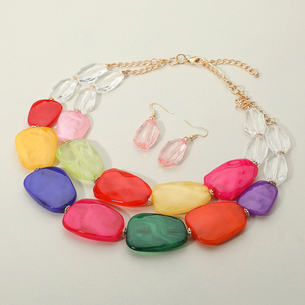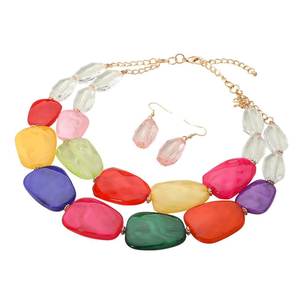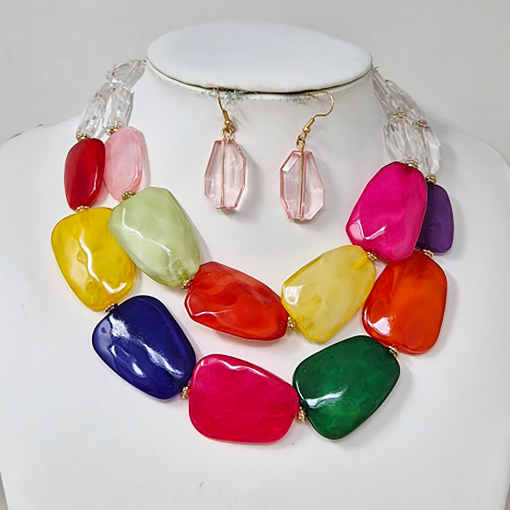 Details • Necklace Size : 17.5" + 3" L • Decor Size : 2" L • Earrings Size : 2" L • Elevate your look with this chunky beaded statement necklace set featuring bold beads in neutral tones of black, white, and smoky brown. Complete with matching drop earrings, this versatile set adds sophistication to both formal attire and chic everyday outfits. • Lead and Nickel Compliant