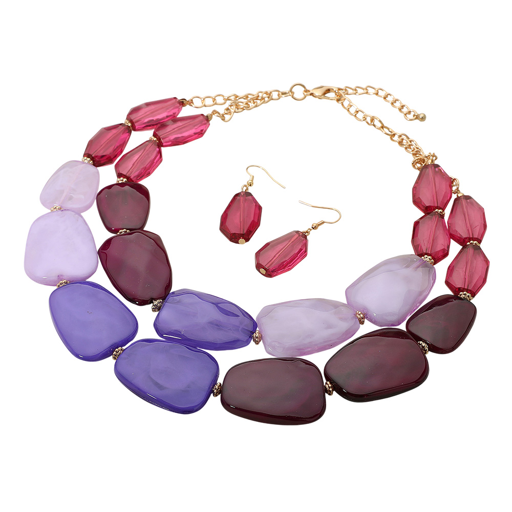 Details • Necklace Size : 17.5" + 3" L • Decor Size : 2" L • Earrings Size : 2" L • Elevate your look with this chunky beaded statement necklace set featuring bold beads in neutral tones of black, white, and smoky brown. Complete with matching drop earrings, this versatile set adds sophistication to both formal attire and chic everyday outfits. • Lead and Nickel Compliant