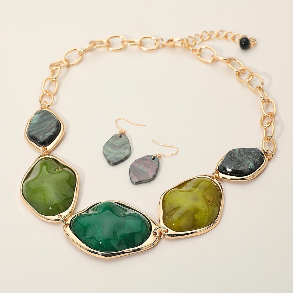 • This chunky gem statement necklace and earring set features an artistic organic design with sculpted, polished stones framed in elegant settings. Perfect for bold, confident style, it adds warmth and sophistication to any outfit, ideal for special occasions or evening wear.