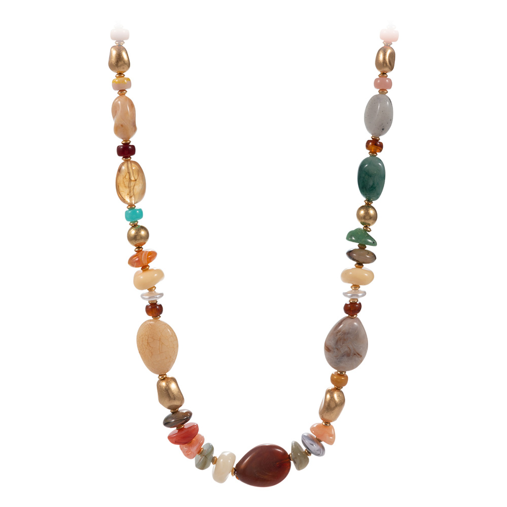 Details • Necklace Size : 18.5" + 3.5" L • Decor Size : 0.75" L • Add a playful touch to your look with this colorful beaded necklace featuring mixed shapes and polished finishes. Perfect for layering or wearing solo, this boho-inspired statement piece enhances casual outfits, parties, or special occasions with vibrant style. • Lead and Nickel Compliant