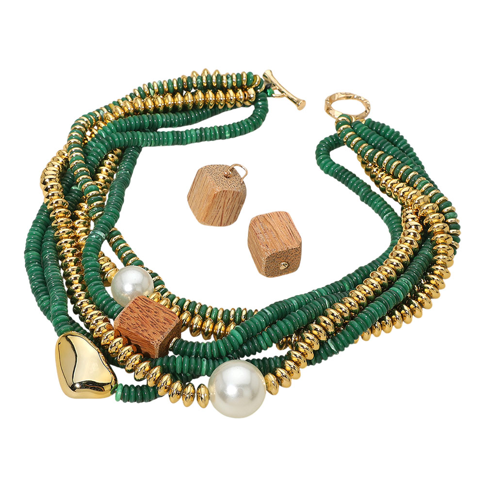 Chunky Pearl Wooden Cube Metal Pebble Accent Multi Disc Beaded Layered Toggle Statement Necklace