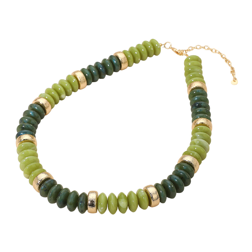 Details • Necklace Size : 17" + 3" L • Decor Size : 0.6" L • Bold and contemporary, this chunky beaded necklace features smooth disc-shaped beads with metallic gold-tone spacers. A versatile statement piece that elevates any outfit with its sleek, modern design. • Lead and Nickel Compliant