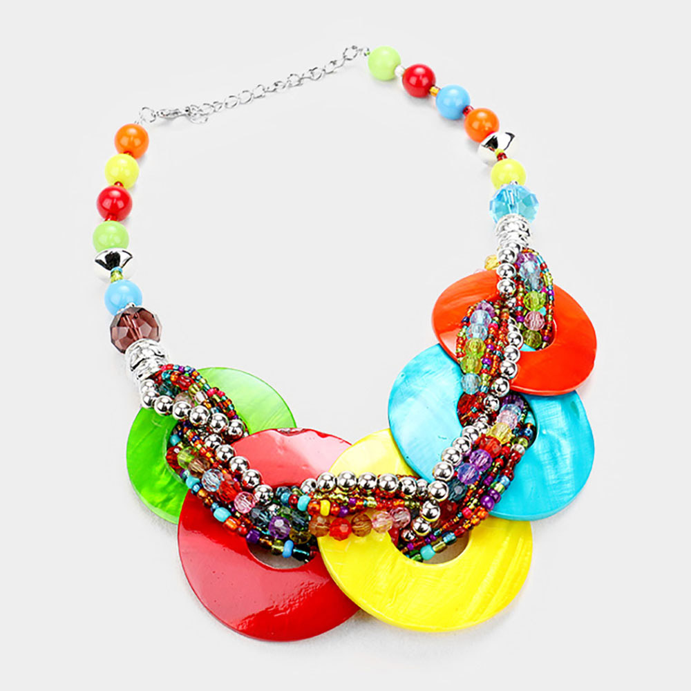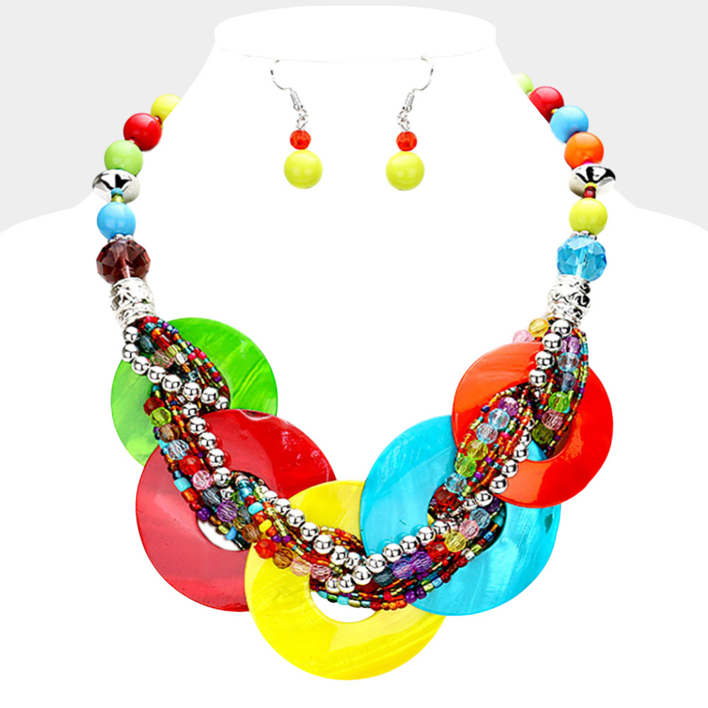 Details • Necklace Size : 17" + 3" L • Decor Size : 2.25" L • Earring Size : 1.5" L • Make a bold impression with this layered beaded statement necklace and matching earrings set. Designed with oversized circular accents and mixed bead strands, it adds vibrant energy and artistic flair to any outfit, perfect for elevating casual or evening looks effortlessly. • Lead and Nickel Compliant