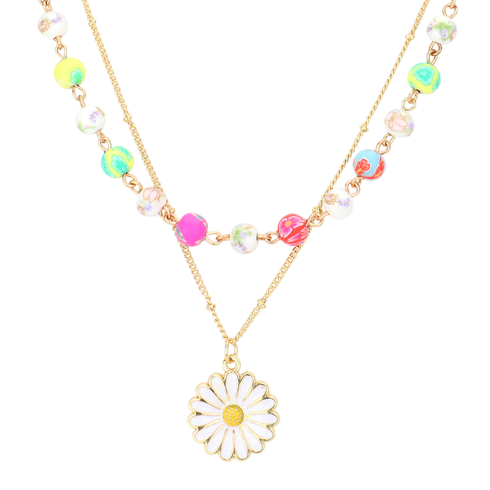 Enamel Daisy Pendant Flower Patterned Beaded Double Layered Necklace