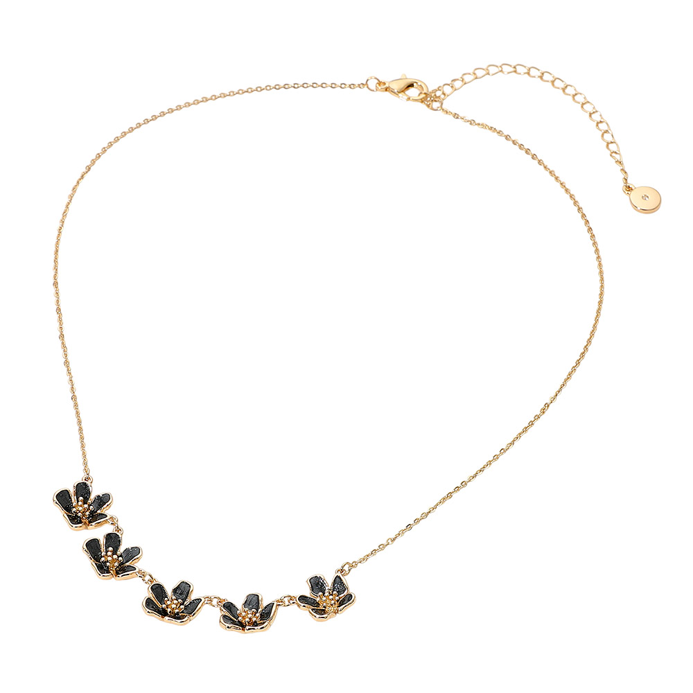 Details • Necklace Size : 16" + 3" L • Decor Size : 0.4" L • Elevate everyday style with the Floral Charm Station Necklace, featuring a series of delicate blossom accents set along a fine chain for graceful movement and subtle sparkle. Perfect for layering or wearing solo as a feminine statement piece. • Brass • Lead and Nickel Compliant