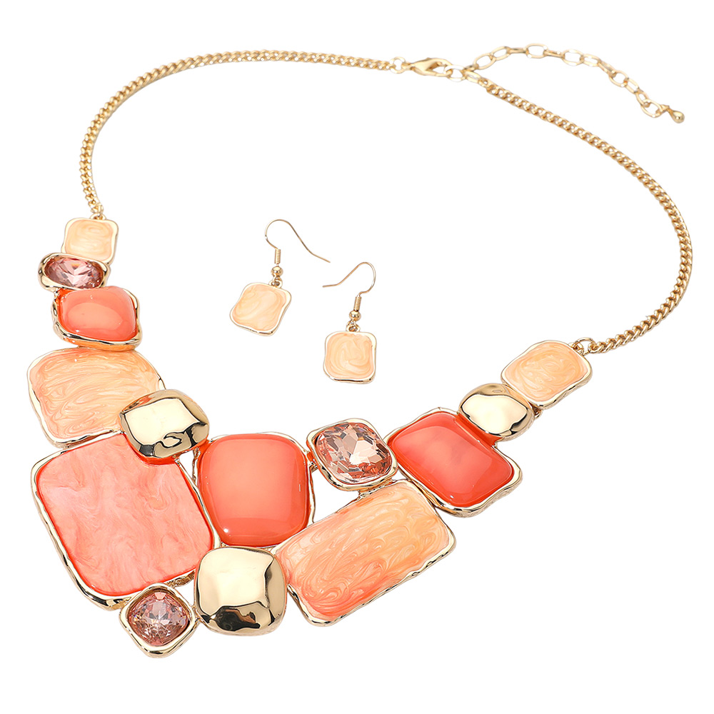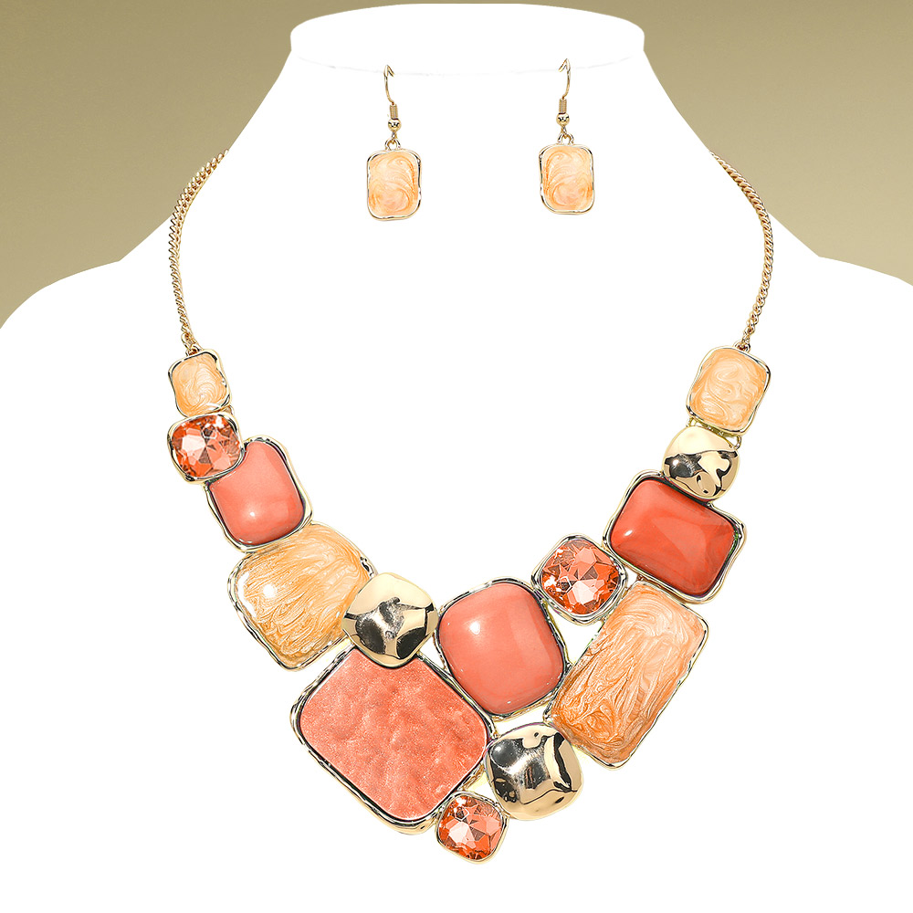 Details • Necklace Size : 18" + 3.5" L • Decor Size : 2.5" L • Earrings Size : 1.4" L • Modern statement necklace and earrings set featuring a mosaic of enamel geometric plate accents framed in metallic trim. The bold mix of smooth and marbled textures adds artistic flair, making it a standout accessory for elegant or contemporary fashion ensembles. • Lead and Nickel Compliant