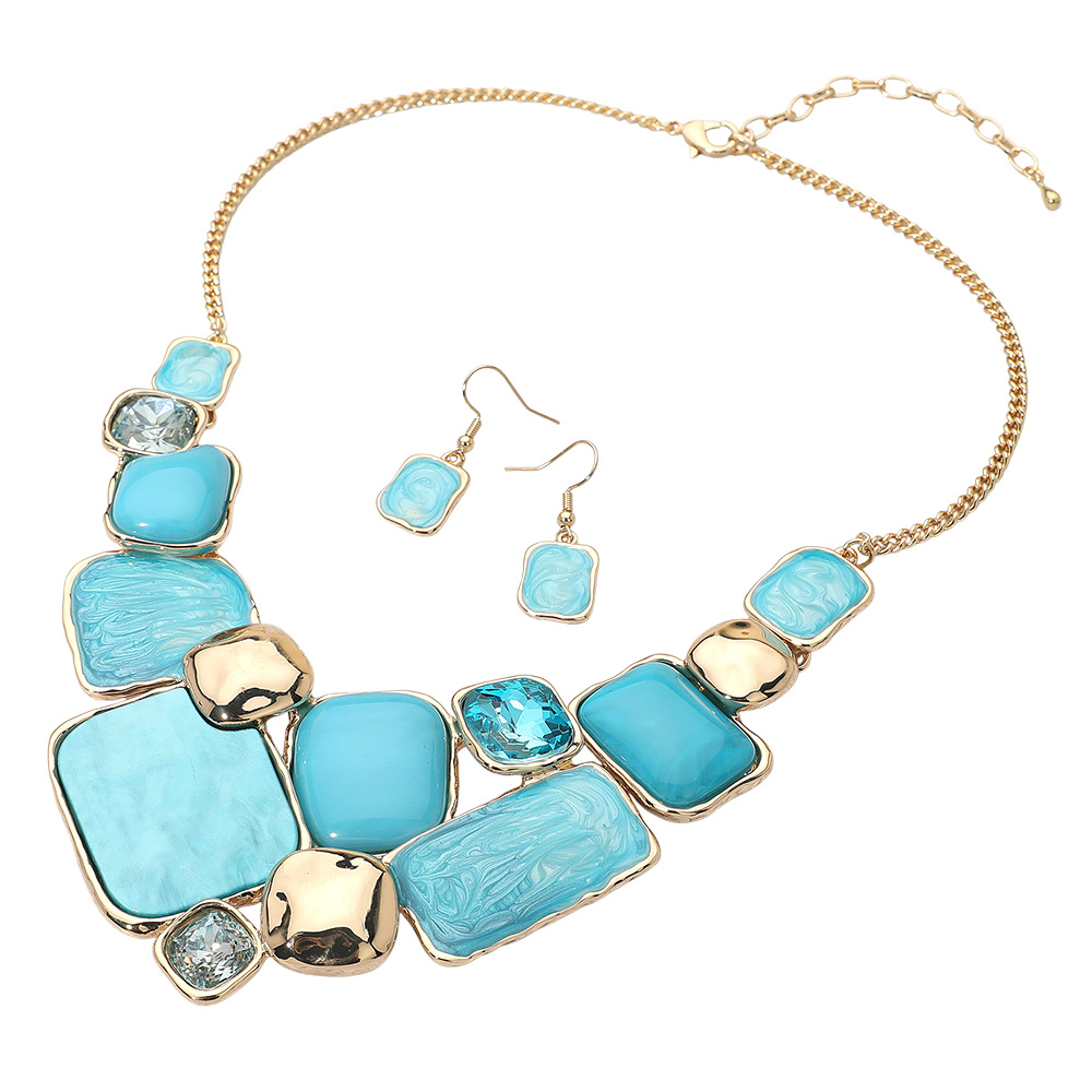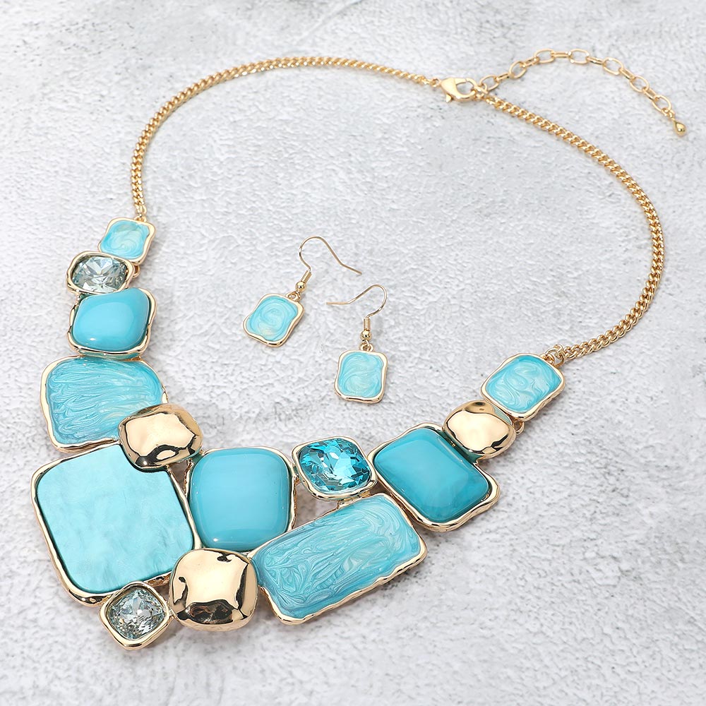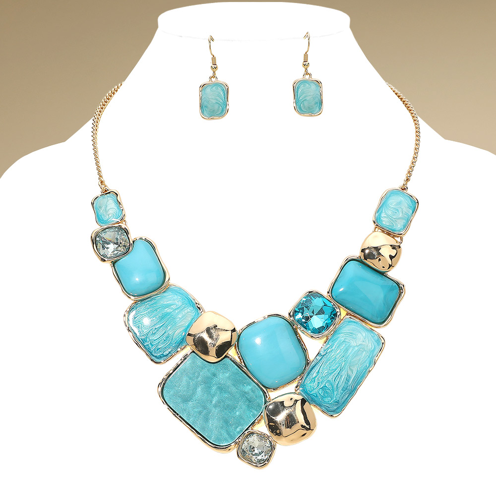Details • Necklace Size : 18" + 3.5" L • Decor Size : 2.5" L • Earrings Size : 1.4" L • Modern statement necklace and earrings set featuring a mosaic of enamel geometric plate accents framed in metallic trim. The bold mix of smooth and marbled textures adds artistic flair, making it a standout accessory for elegant or contemporary fashion ensembles. • Lead and Nickel Compliant