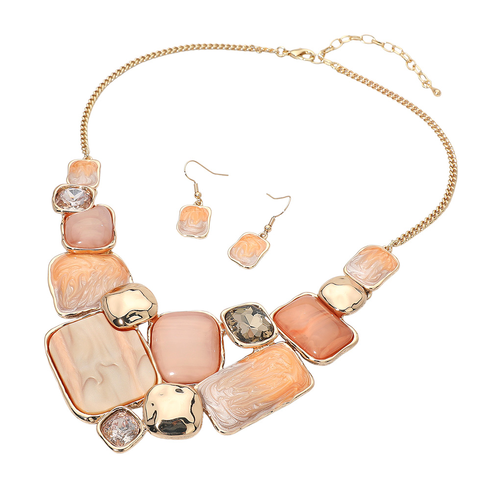 • Modern statement necklace and earrings set featuring a mosaic of enamel geometric plate accents framed in metallic trim. The bold mix of smooth and marbled textures adds artistic flair, making it a standout accessory for elegant or contemporary fashion ensembles.