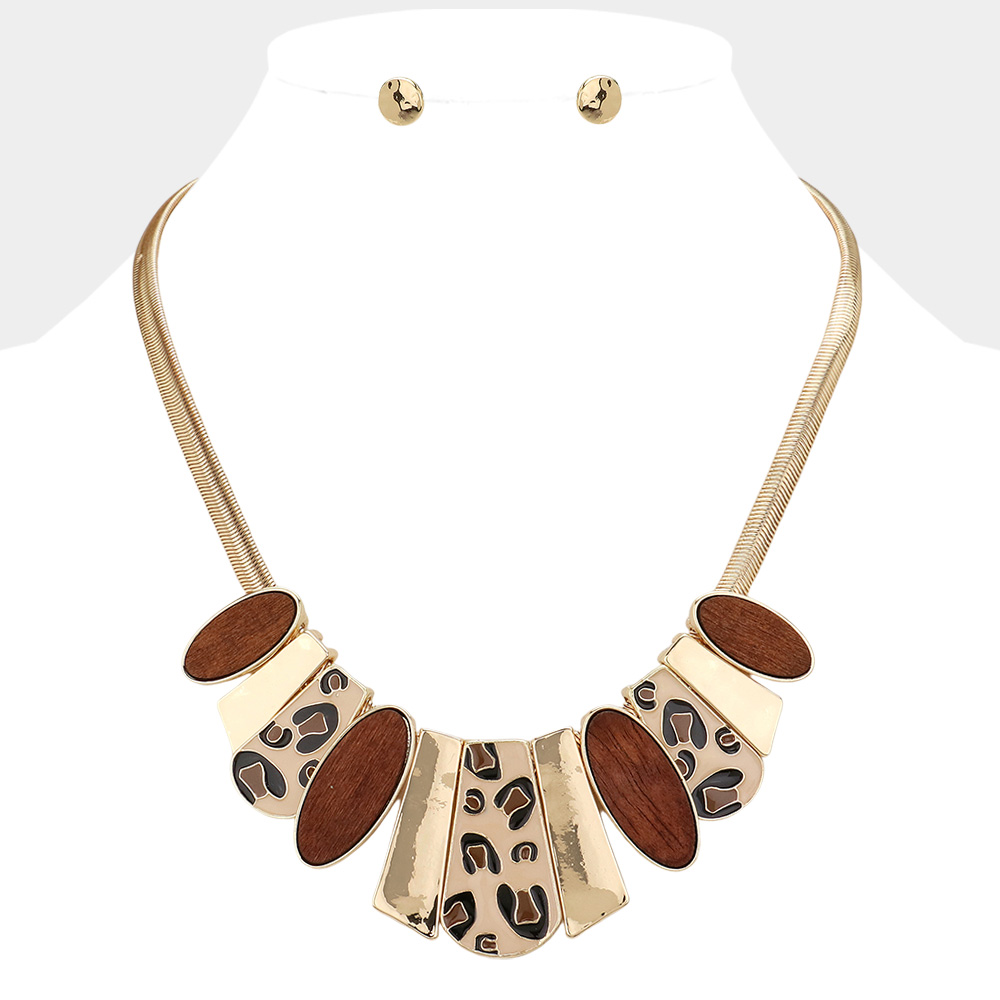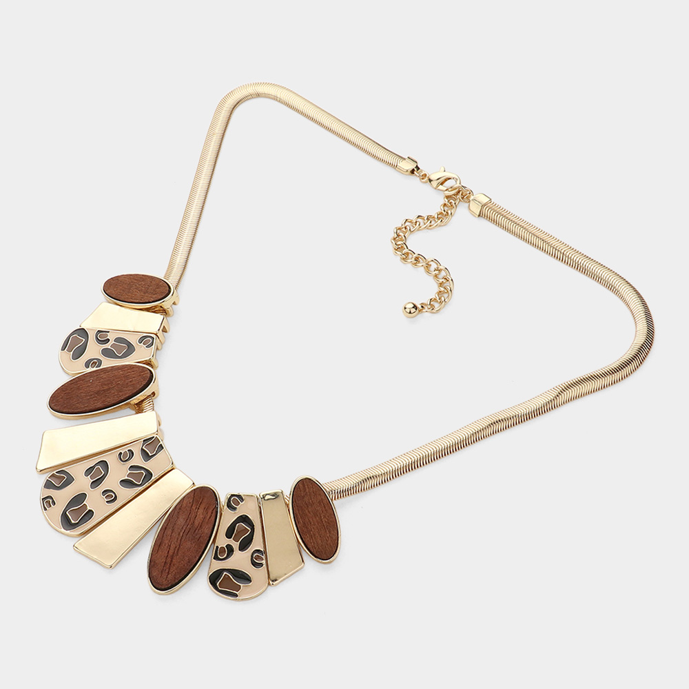 Enamel Leopard Plate Wood Marquise Plate Link Pendant Pointed Herringbone Chain Necklace