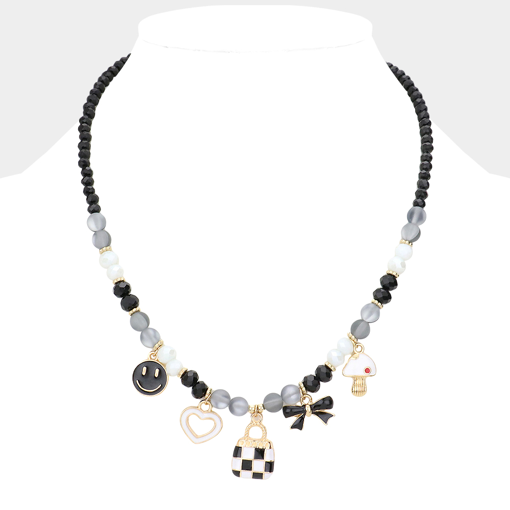 Enamel Smile Heart Tote Bag Bow Mushroom Pendant Station Beaded Necklace