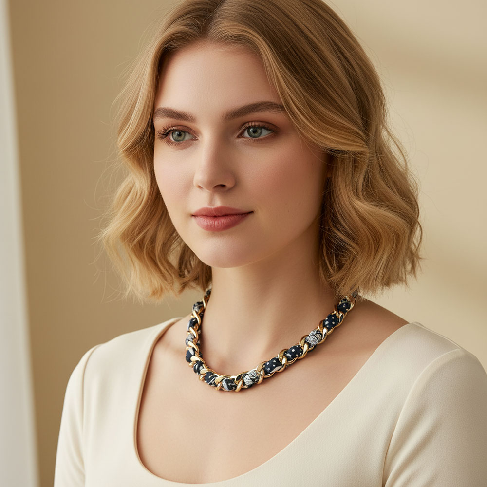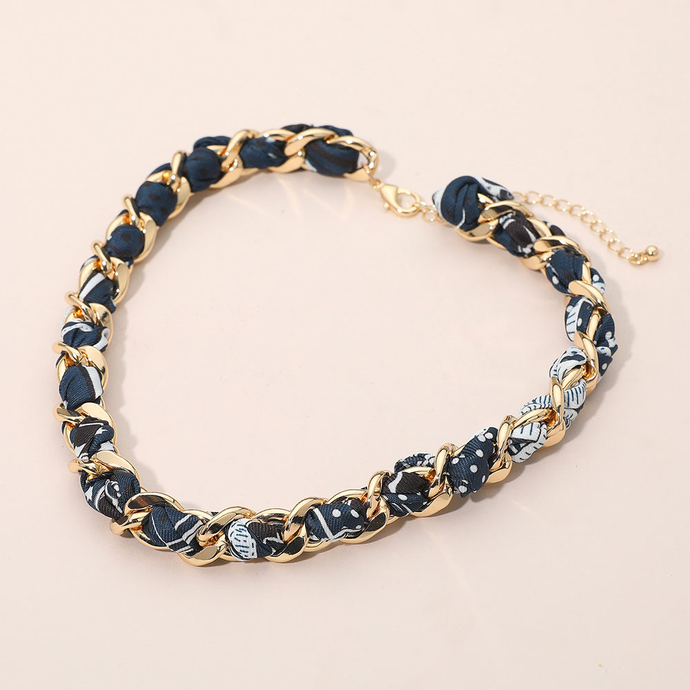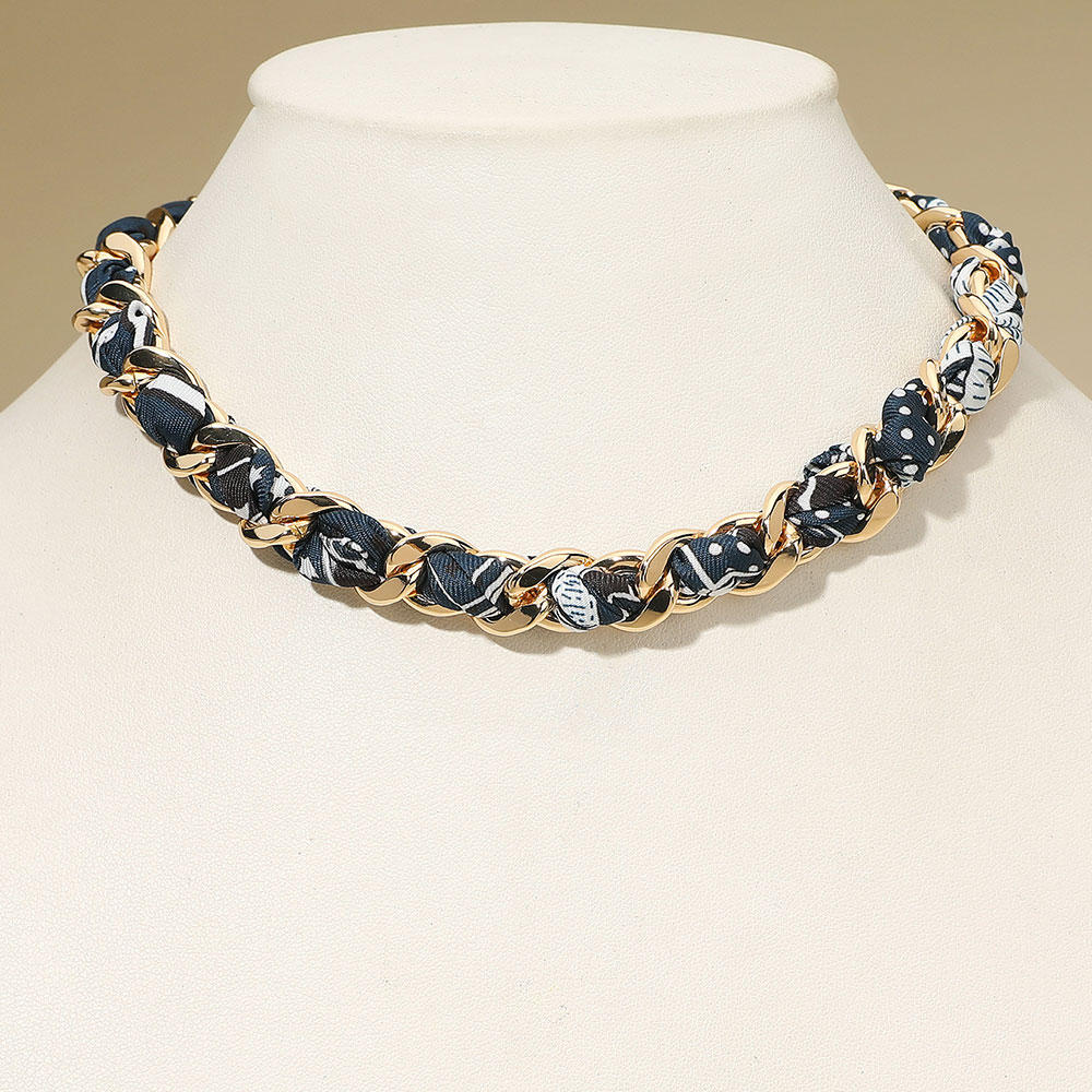 Details • Necklace Size : 15.5" + 3" L • Decor Size : 0.5" L • Print may vary • This stylish chain link necklace features an interwoven fabric design for a chic and modern twist on a classic look. With its adjustable clasp, it offers both comfort and versatility, making it an ideal accessory to elevate casual outfits or complement elegant attire. • Lead and Nickel Compliant