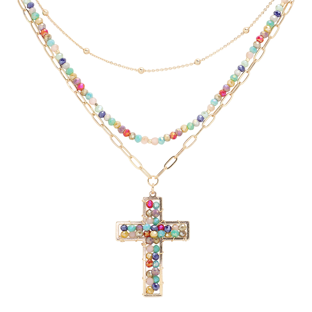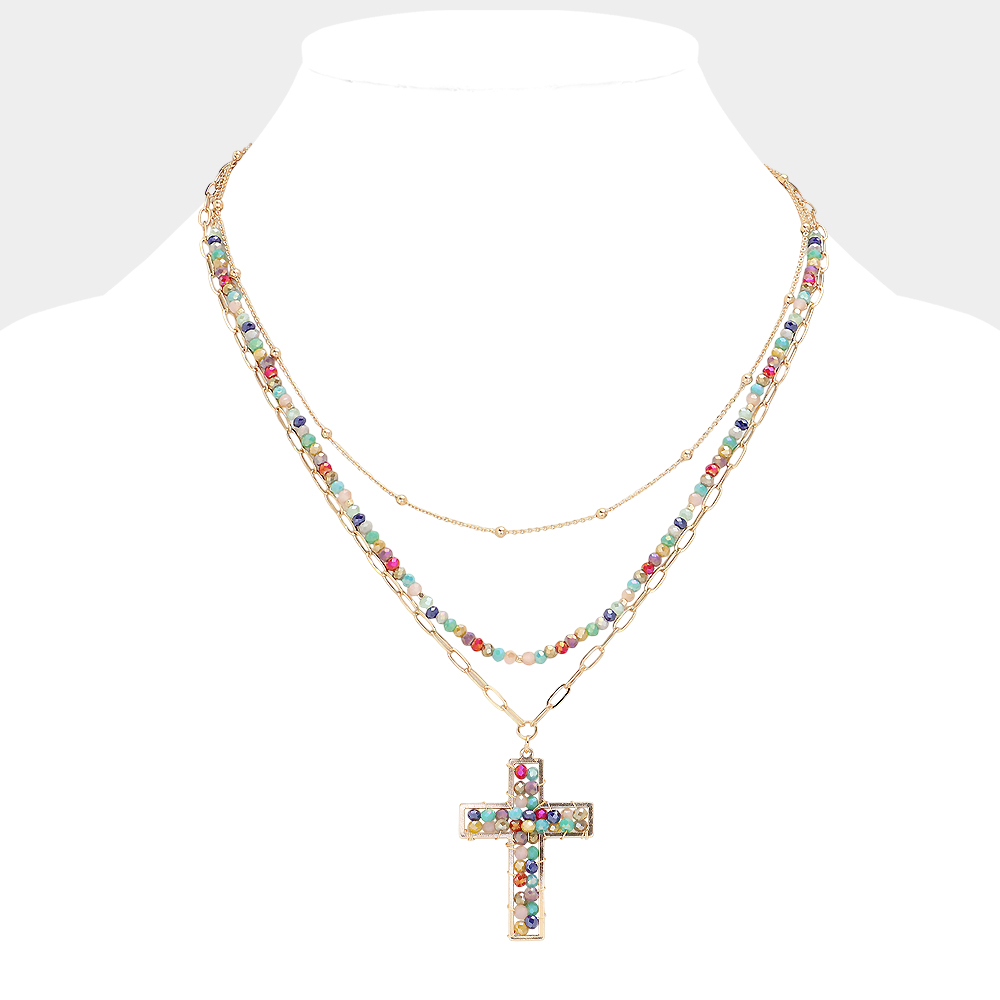 Faceted Beaded Metal Paperclip Chain Layered Cross Pendant Necklace