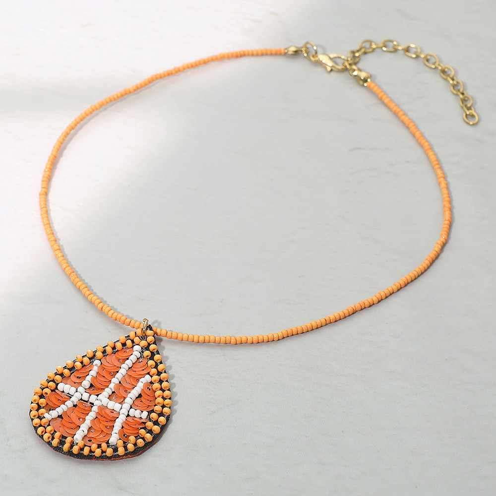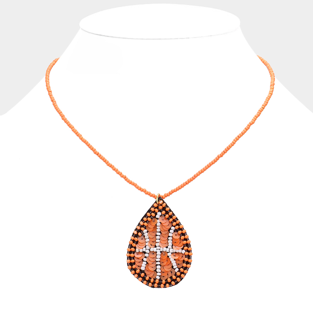 Details • Necklace Size : 14" + 3" L • Pendant Size : 1.3" X 1.75" • Sporty teardrop pendant necklace featuring a basketball-inspired sequin design on a beaded chain. A fun and stylish accessory perfect for game days or casual wear. Lightweight and eye-catching, it adds a playful athletic flair to any outfit or fan-inspired look. • Lead and Nickel Compliant • Made In India