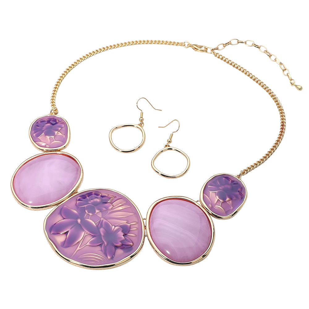 • Elegant statement necklace and earrings set featuring embossed floral designs on smooth, polished oval accents. The sculpted flowers and glossy finish add a touch of sophistication, perfect for enhancing formal outfits or making a bold fashion statement.