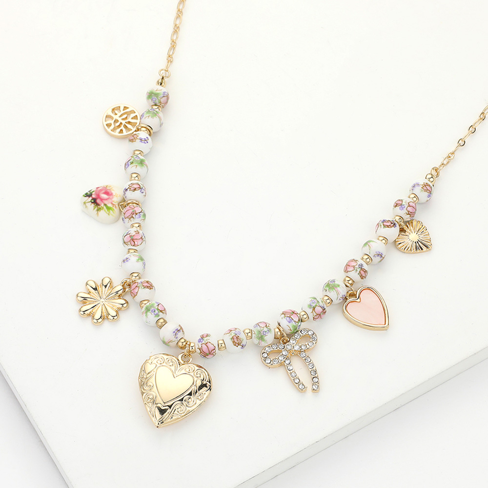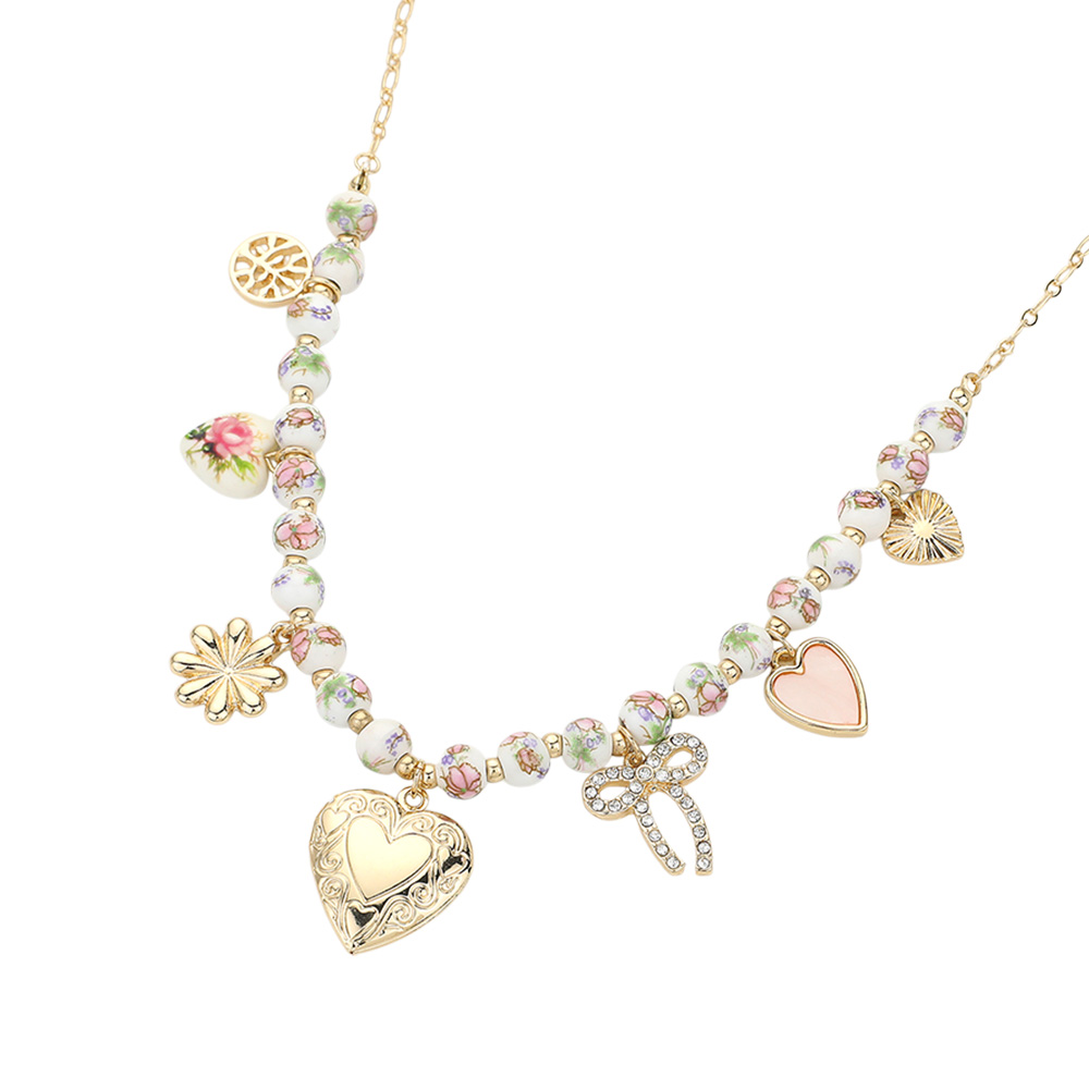 Floral Heart Pearl Heart Locket Charm Station Necklace