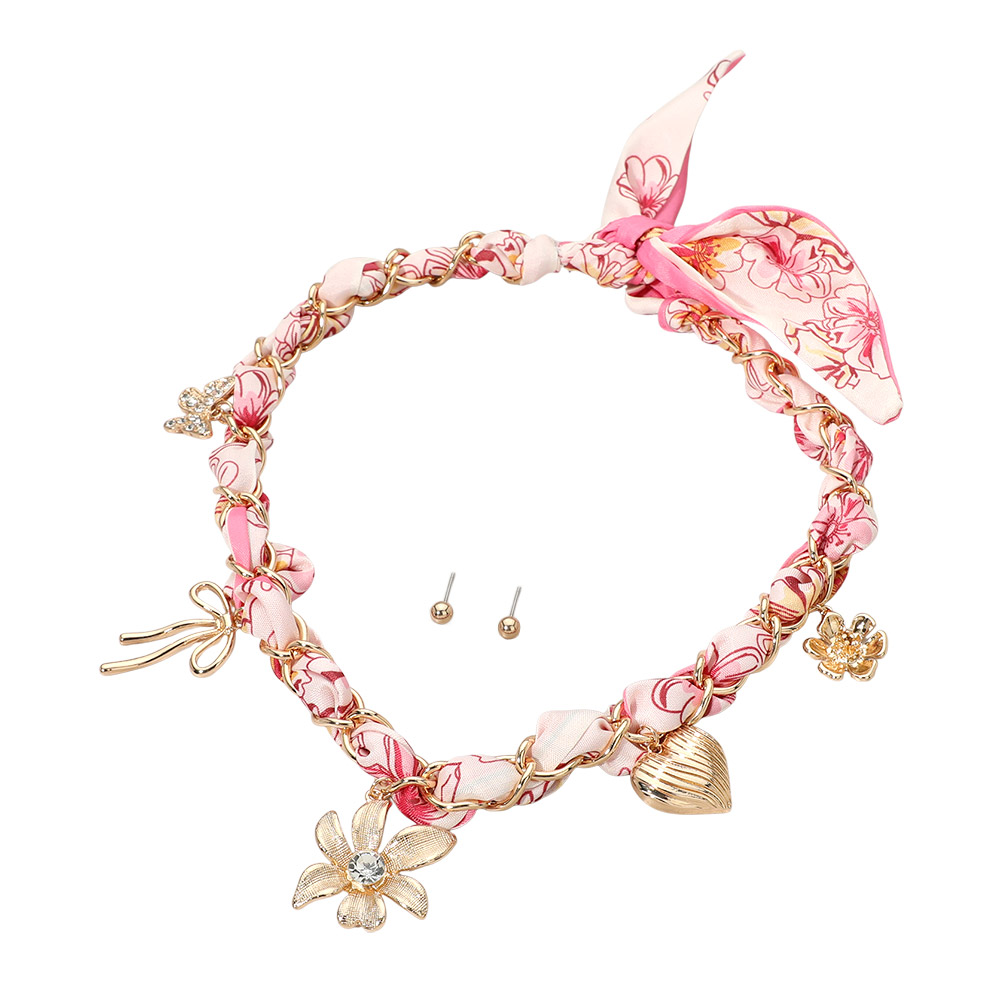 Details • Necklace Size : 27" L • Decor Size : 1.75" L • Earrings Size : 0.2" L • Decorative scarf necklace set featuring layered charm accents and matching stud earrings for a coordinated statement look. Designed to add visual interest and movement, this fashion accessory is ideal for boutiques, seasonal collections, gifting displays, and trend-driven assortments that highlight feminine and playful styling. • Lead and Nickel Compliant