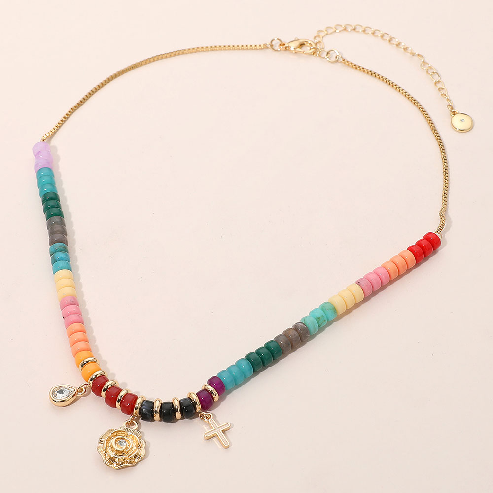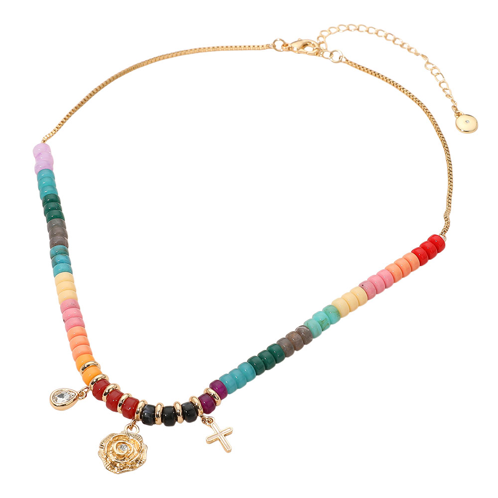 Details • Necklace Size : 16" + 3.5" L • Decor Size : 1" L • Brighten your look with this multicolor bead charm necklace featuring vibrant tones and elegant gold accents. Adorned with symbolic pendants including a cross and medallion, this statement piece blends playful energy with refined style for a chic, expressive finish. • Lead and Nickel Compliant