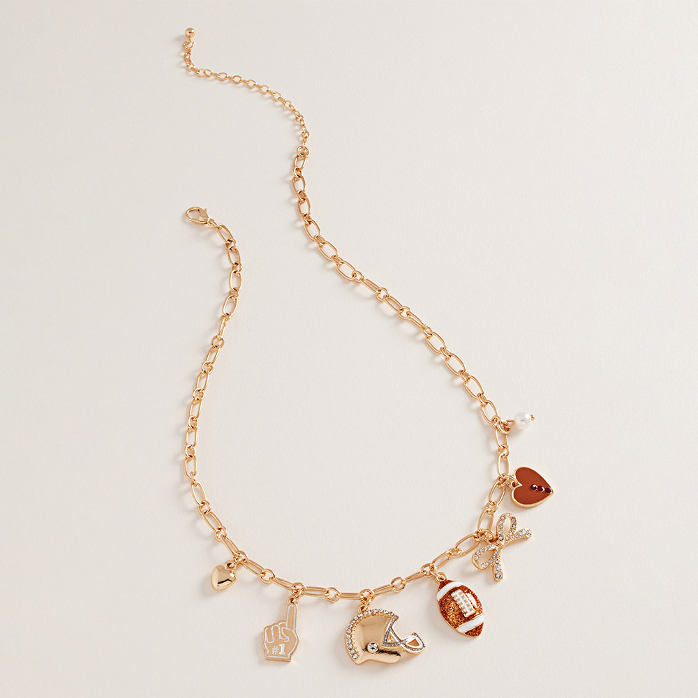 Details • Necklace Size : 16" + 3" L • Decor Size : 1" L • Stylish necklace featuring football-themed charms including a helmet, ball, and fan icons. Perfect accessory for game days, sports fans, or gifting occasions. Adds a fun athletic touch to any outfit. • Lead and Nickel Compliant