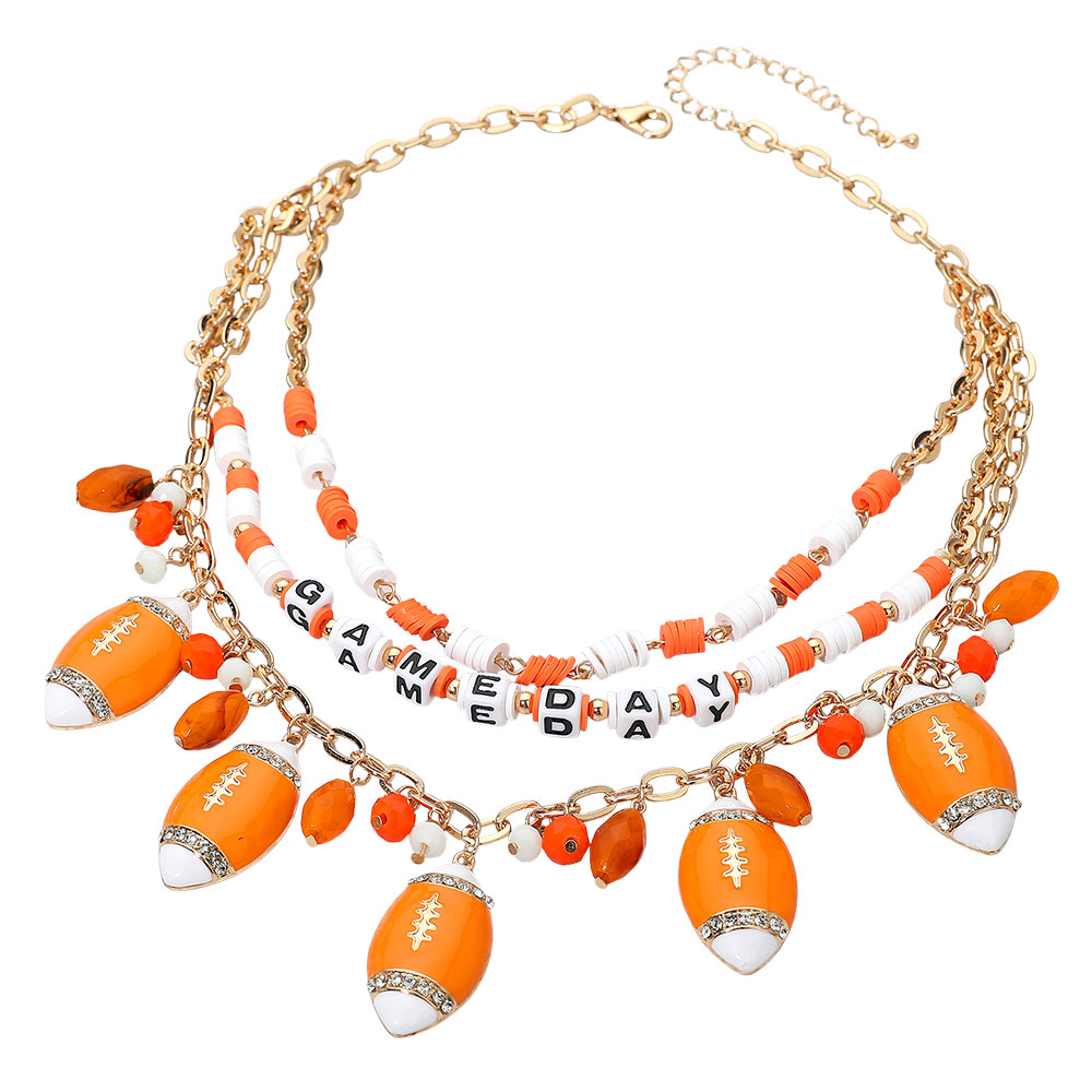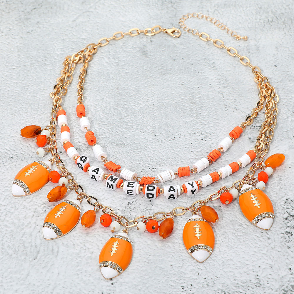 Details • Necklace Size : 16.5" + 3" L • Decor Size : 3.5" L • Layered necklace featuring football charms, gameday letter beads, and playful accents. A spirited accessory to show team pride, add energy to gameday looks, and complete fan outfits with fun layered style. • Lead and Nickel Compliant