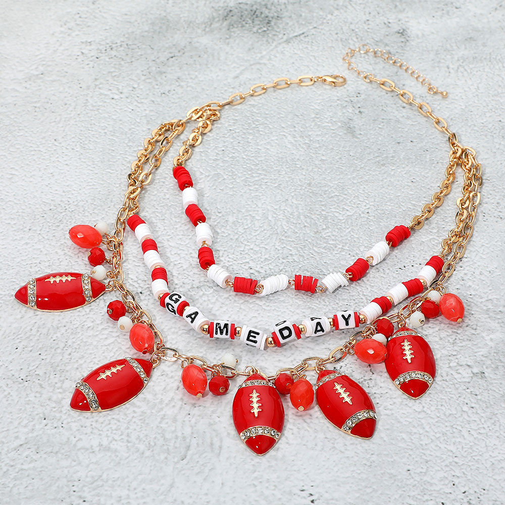 Details • Necklace Size : 16.5" + 3" L • Decor Size : 3.5" L • Layered necklace featuring football charms, gameday letter beads, and playful accents. A spirited accessory to show team pride, add energy to gameday looks, and complete fan outfits with fun layered style. • Lead and Nickel Compliant