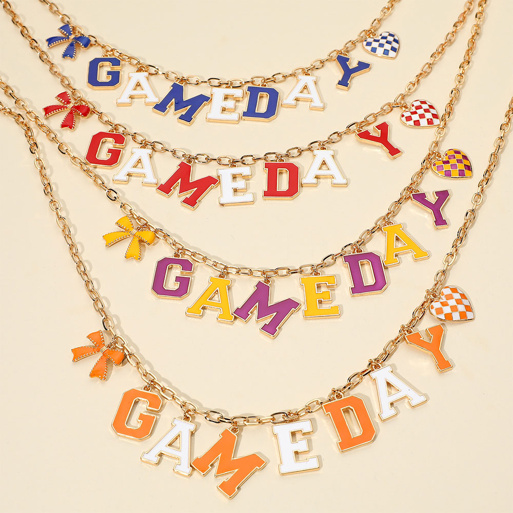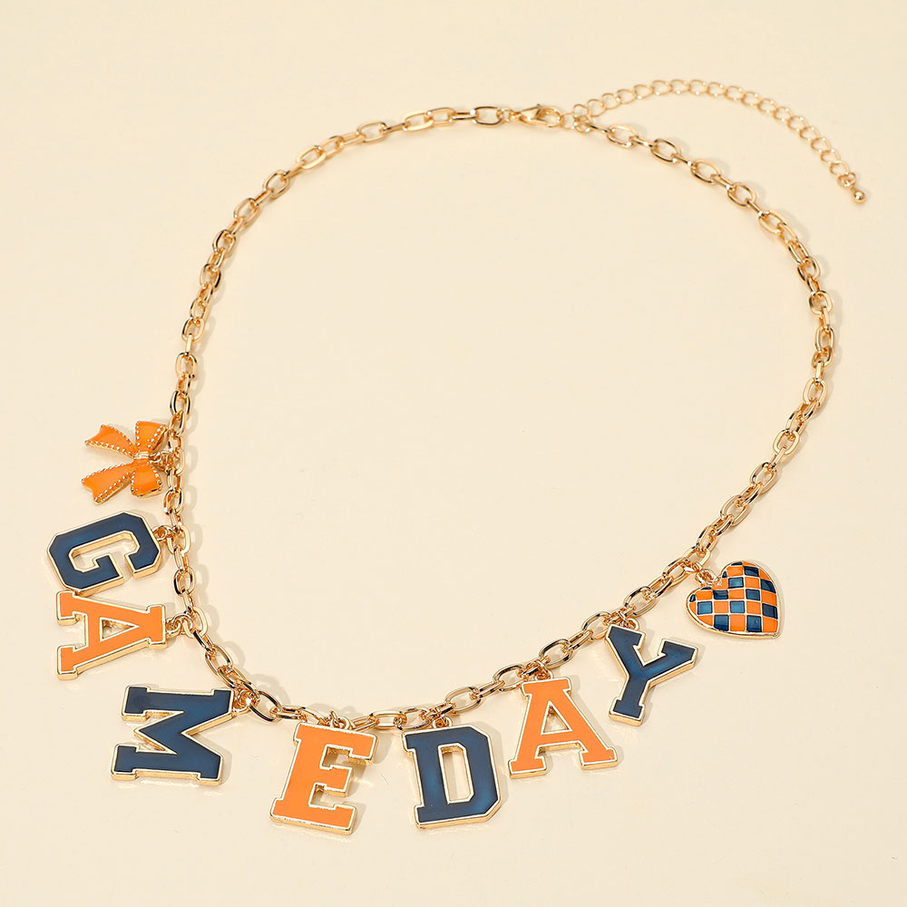• Celebrate your team spirit with this game day necklace featuring bold letter charms and playful accent pieces. A perfect accessory to complete your spirited outfit for sporting events, tailgates, or fan gatherings.