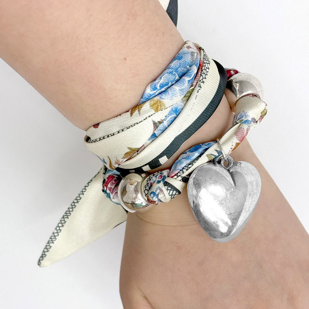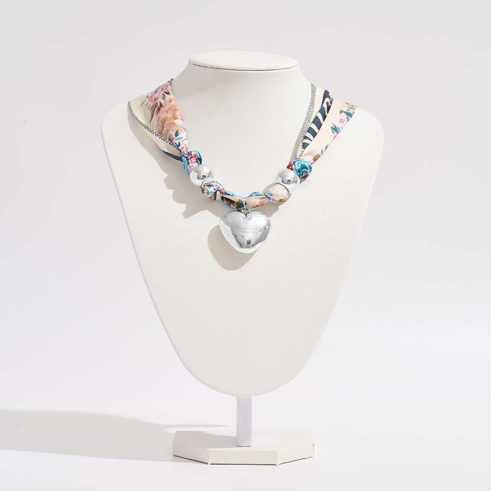 Details • Size : 30" L • Charm Size : 1.75" L • Print may vary • A stylish accessory designed to be worn as a necklace, bracelet, or bag charm. Crafted with a printed scarf and accented with spheres and a bold heart pendant, it adds elegance and versatility. Available in gold or silver for chic everyday or statement styling. • Brass • Gold Dipped • Hypoallergenic • Lead and Nickel Compliant • Made In Korea