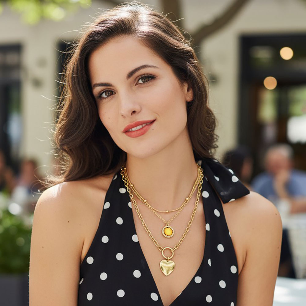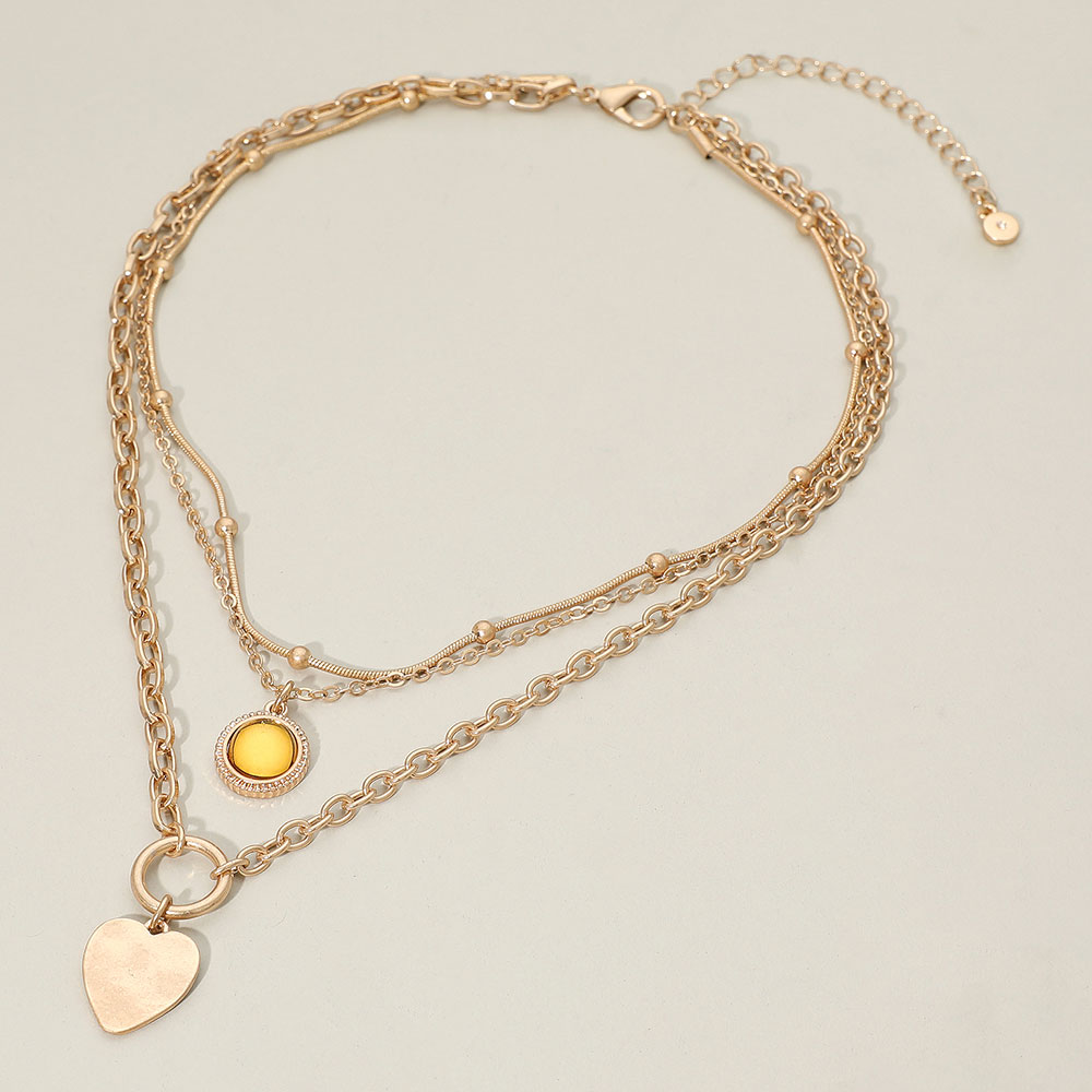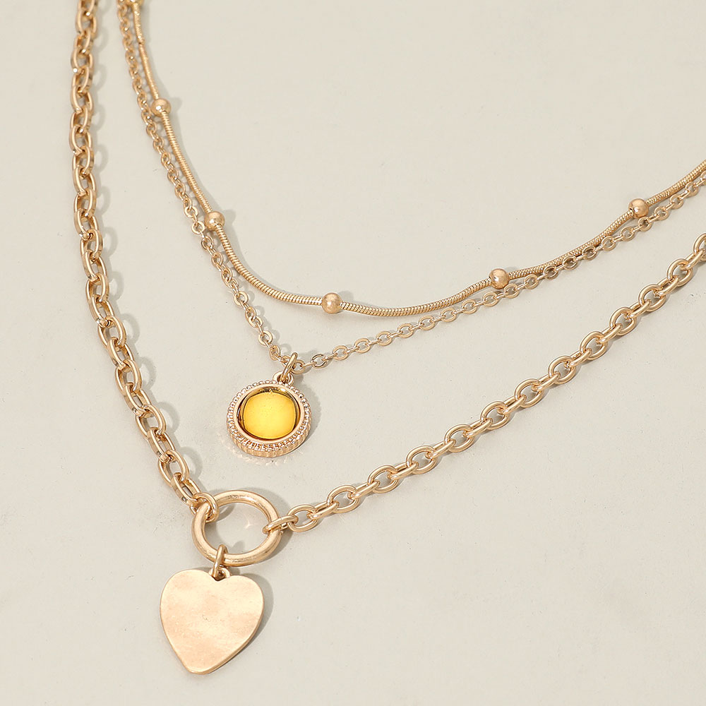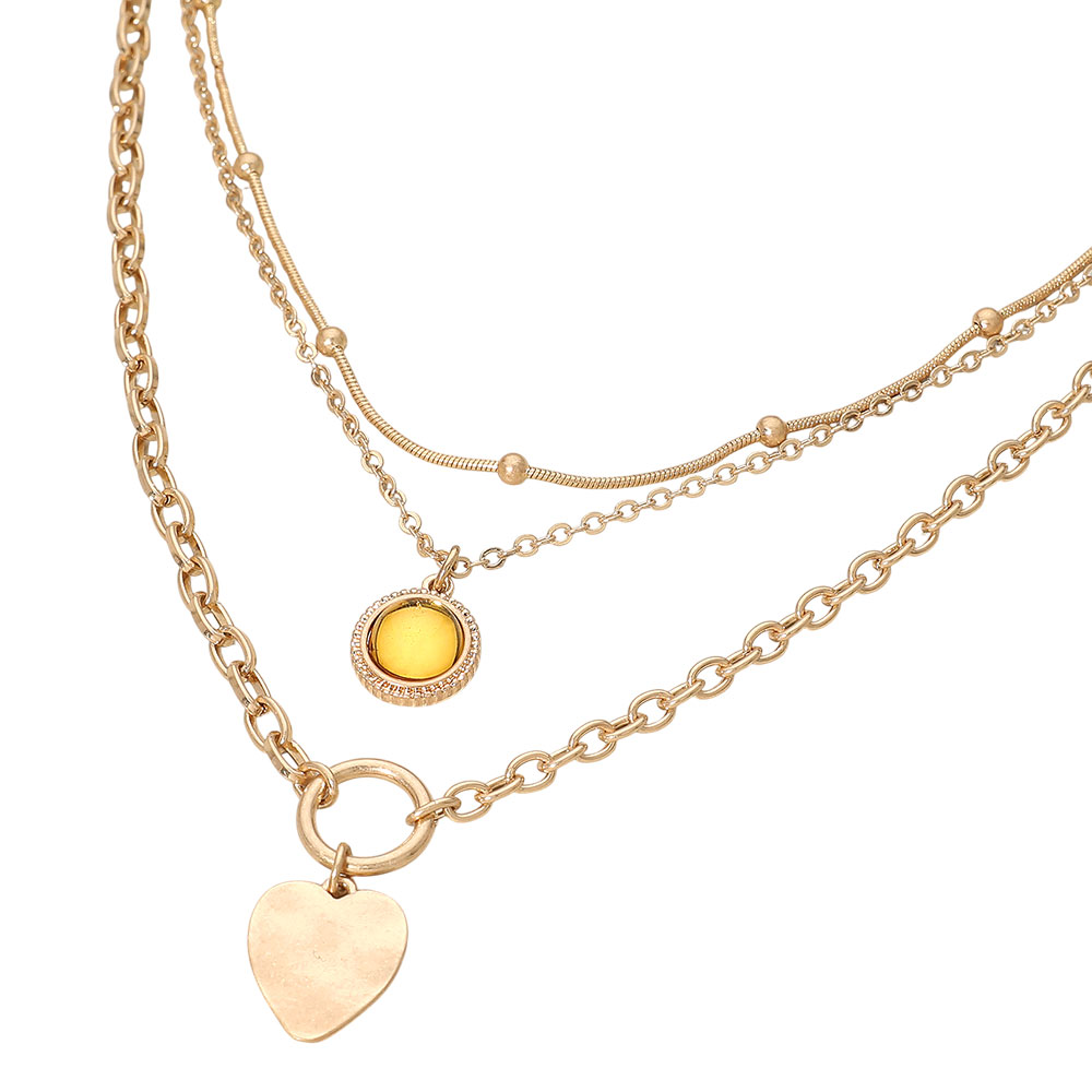 Details • Necklace Size : 14.5" + 3.5" L • Decor Size : 3.4" L • Add a touch of charm to everyday style with the Layered Heart Charm Necklace, featuring layered chains accented by a soft heart pendant and a glowing round detail for subtle sparkle and depth. Ideal for solo wear or stacking with other favorites to create a modern, romantic look. • Lead and Nickel Compliant