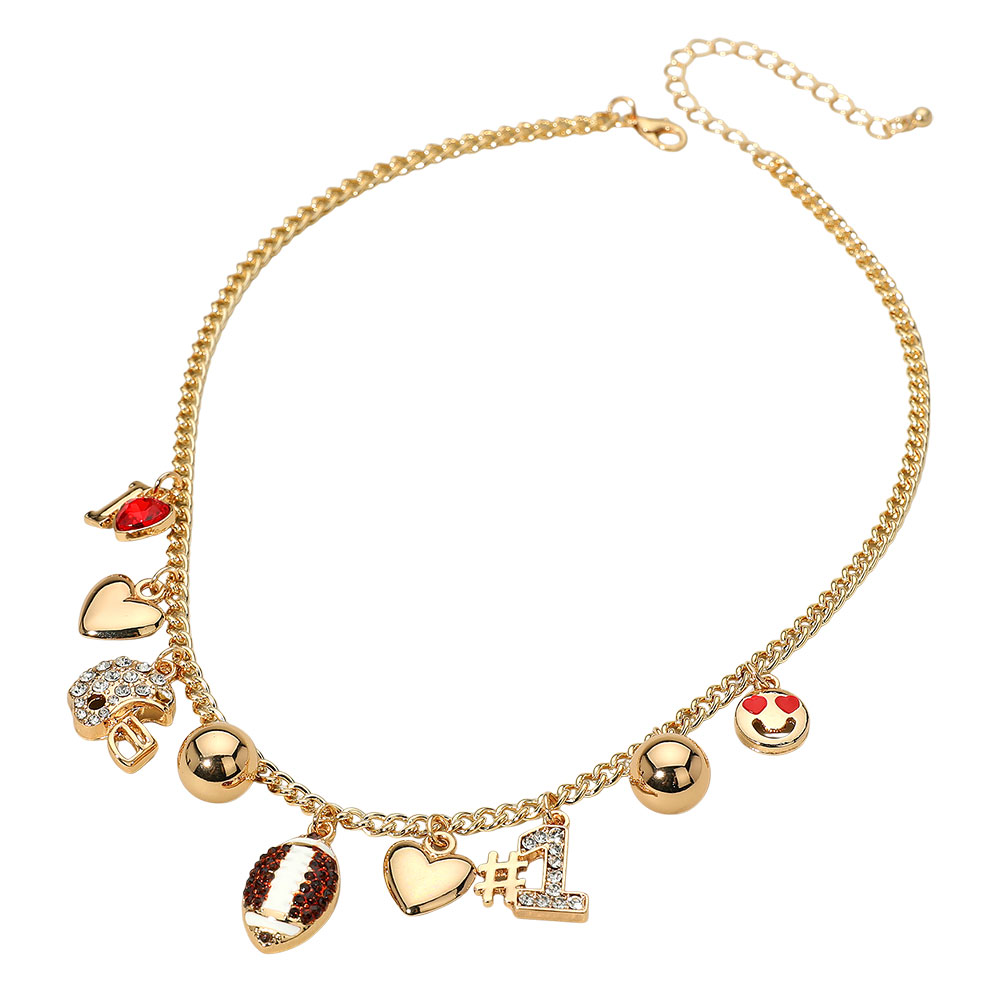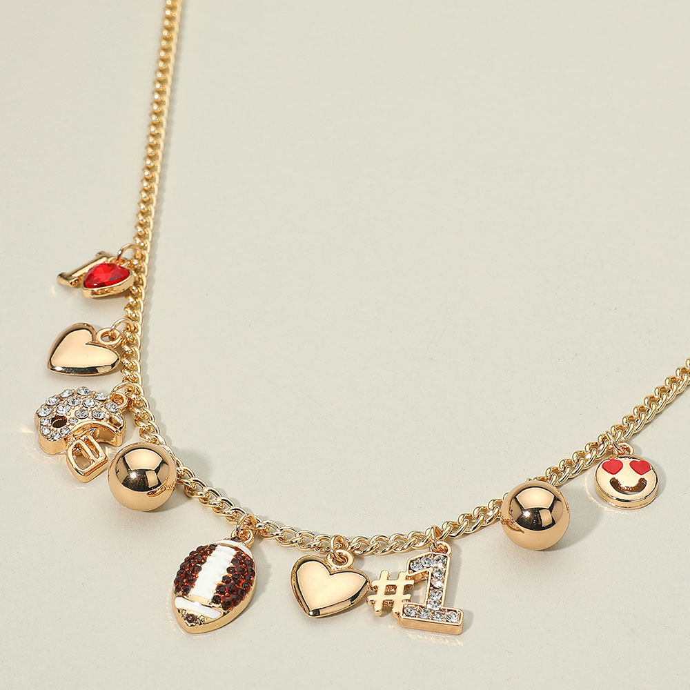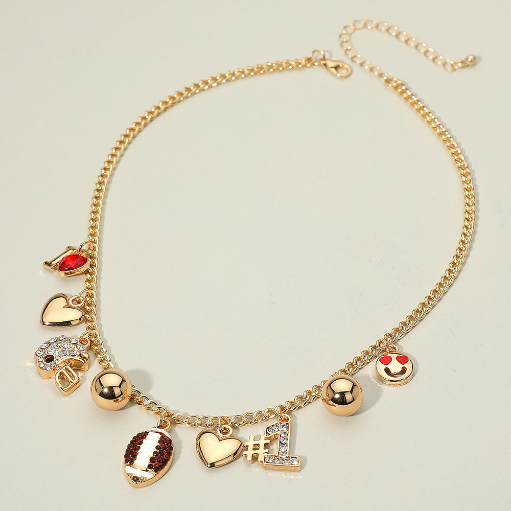 Details • Necklace Size : 16" + 3" L • Decor Size : 1" L • Show off your game-day spirit with this football charm necklace featuring fun pendants like a ball, trophy, heart, and emoji. Its playful design blends sporty flair with trendy charm, making it the perfect accessory for fans who love to sparkle on and off the field. • Lead and Nickel Compliant