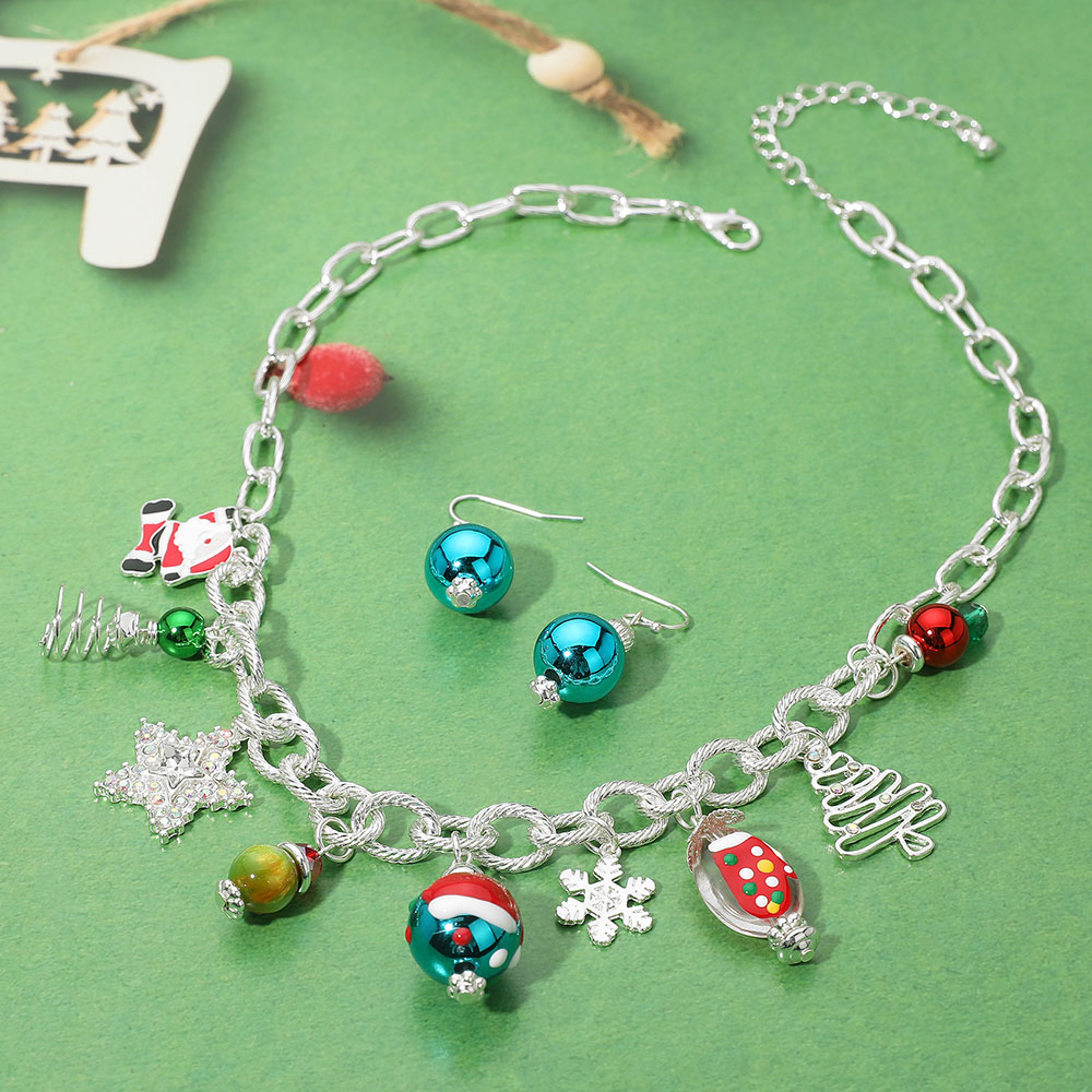 Details • Necklace Size : 18" + 3" L • Decor Size : 1.75" L • Earrings Size : 1.5" L • Festive holiday jewelry set featuring a charm necklace with seasonal motifs and matching drop earrings. A playful, statement-making accessory perfect for parties, gifting, and adding cheerful sparkle to your celebration looks. • Lead and Nickel Compliant