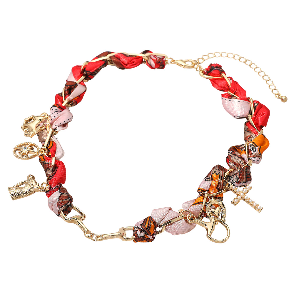 Details • Necklace Size : 16" + 3.25" L • Decor Size : 1.2" L • Pattern May Vary • Stand out with this scarf necklace adorned with gold charms including a cross, horseshoe, and nautical accents. A creative mix of fabric and metal, this bold accessory brings chic detail and playful elegance to any fashion-forward outfit. • Lead and Nickel Compliant