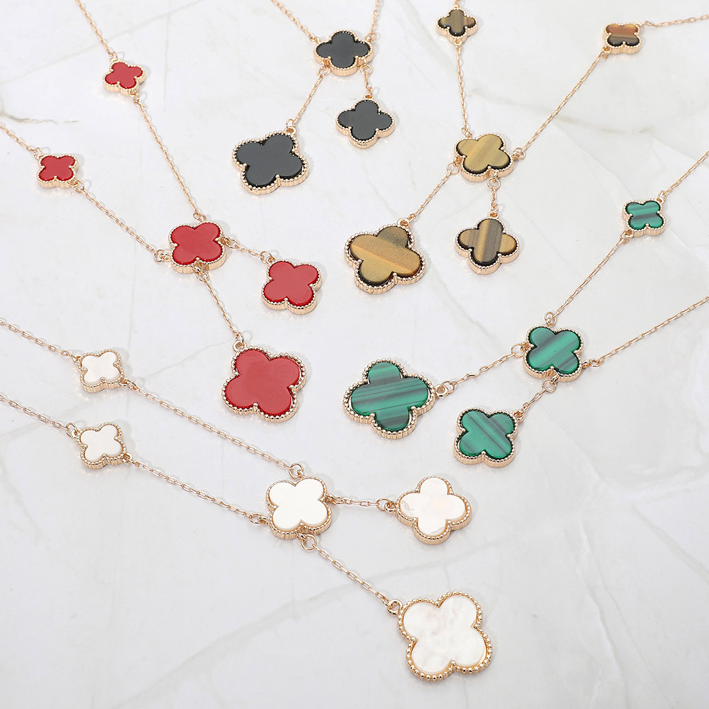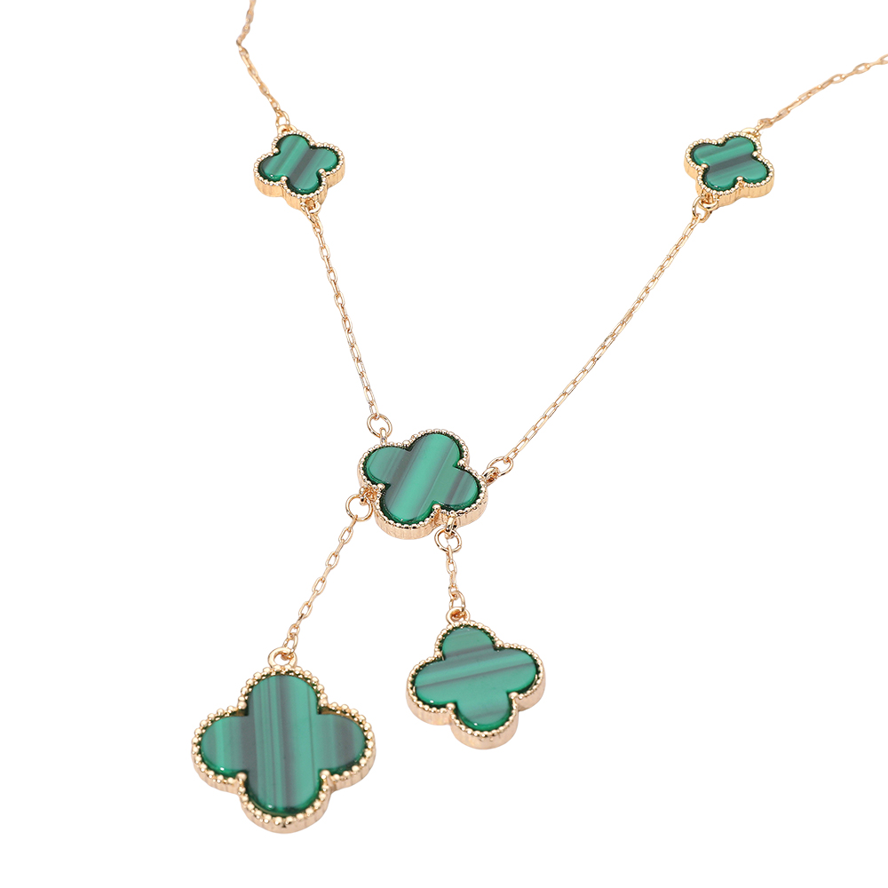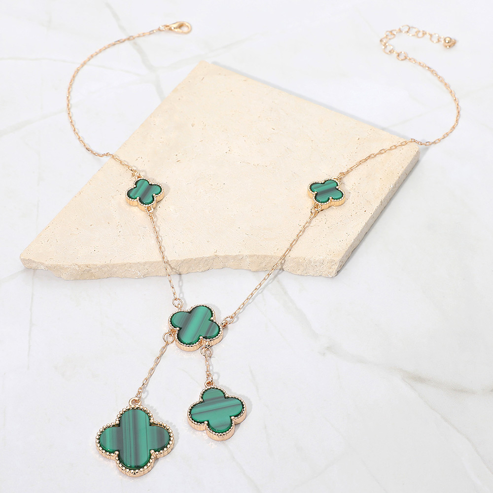 Details • Necklace Size : 16" + 2" L • Decor Size : 3" L • Stylish necklace featuring multiple quatrefoil pendants in a cascading layered design. The elegant drop detail adds movement and sophistication, making it perfect for both casual and formal wear, offering a timeless charm that enhances any outfit effortlessly. • Lead and Nickel Compliant