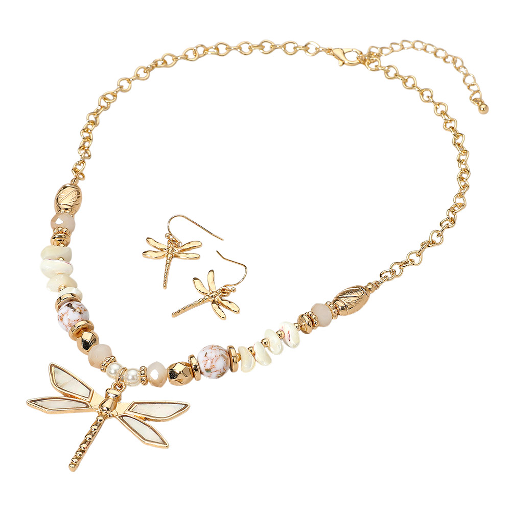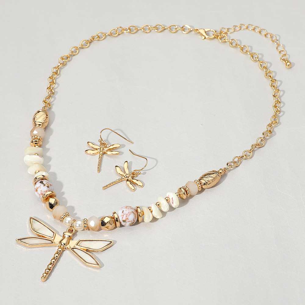 Details • Necklace Size : 18" + 3" L • Decor Size : 0.3" L • Pendant Size : 1.8" X 1.4" • Earrings Size : 1.25" L • Elegant jewelry set featuring a dragonfly pendant necklace with matching earrings and a mix of decorative beads. Perfect for adding a whimsical, nature-inspired accent to any outfit or occasion. • Lead and Nickel Compliant