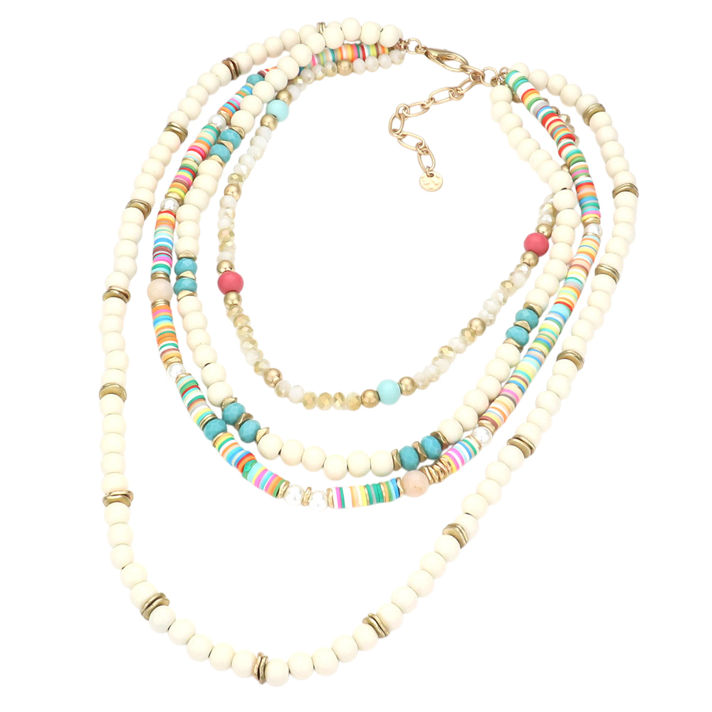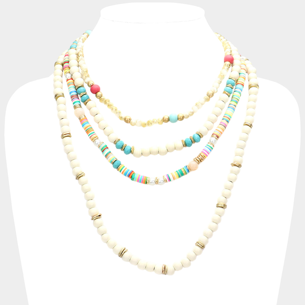 Multi Layered Wood Heishi Beaded Bib Necklace