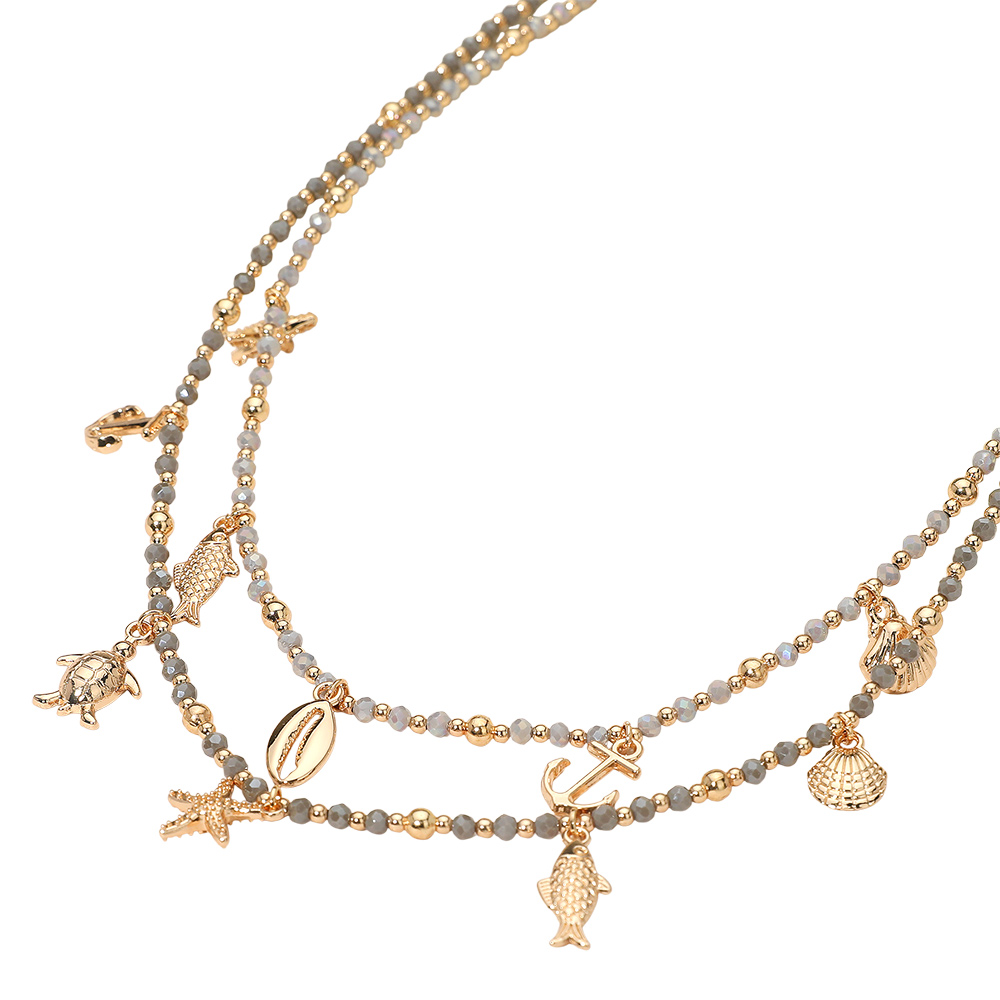 Details • Necklace Size : 16.5" + 3" L • Decor Size : 2" L • This layered beaded necklace features charming ocean-inspired pendants including seashells, fish, and anchors. A stylish accessory that brings a touch of coastal elegance to your look, perfect for adding playful detail to everyday or vacation outfits. • Lead and Nickel Compliant