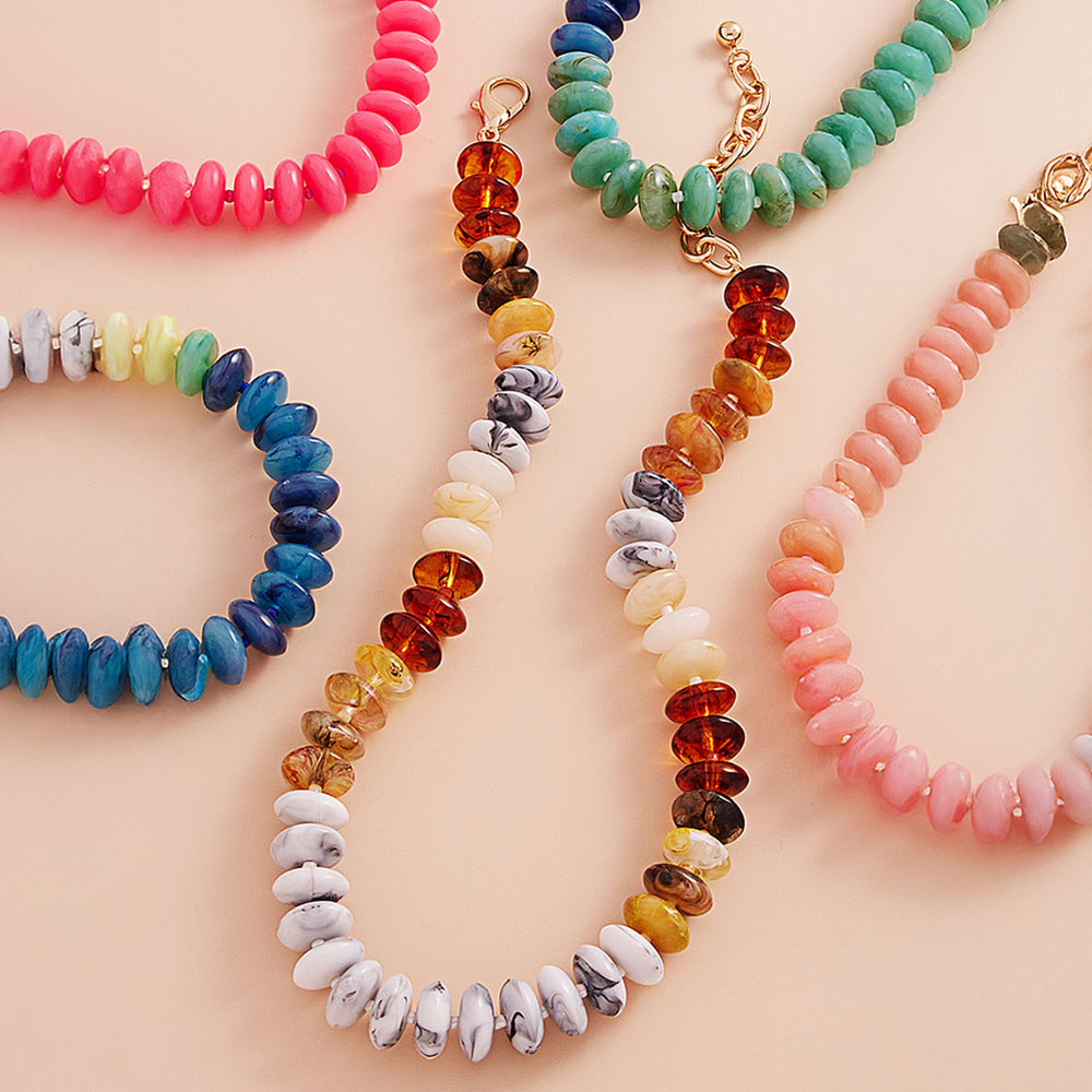 Details • Necklace Size : 17.5" + 3.5" L • Decor Size : 0.5" L • Vibrant disc bead necklace featuring a stunning mix of marbled and bright tones. Perfect for adding a fun and bold touch to your casual or beach-inspired outfits. Lightweight and easy to style. • Lead and Nickel Compliant