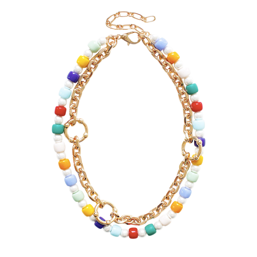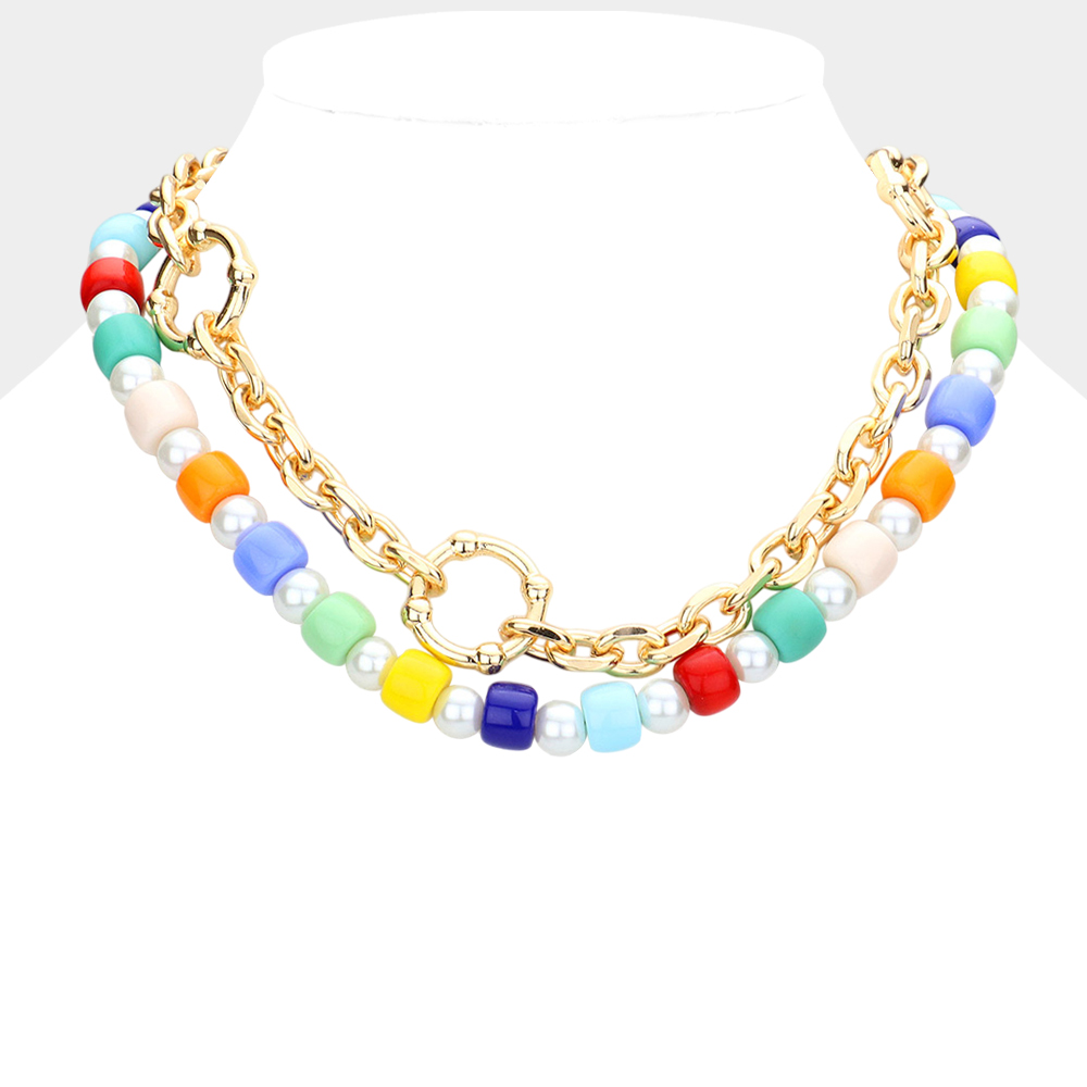 Open Metal Circle Accented Pearl Resin Beaded Double Layered Necklace
