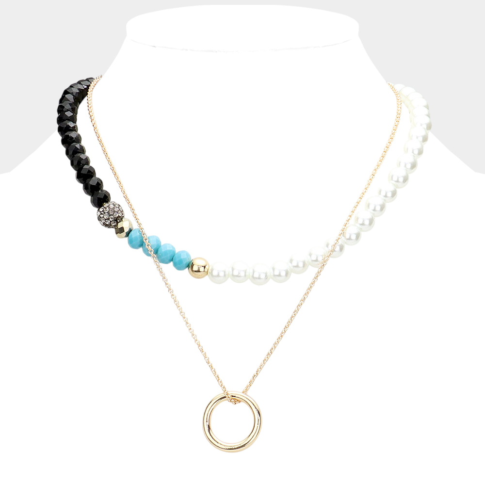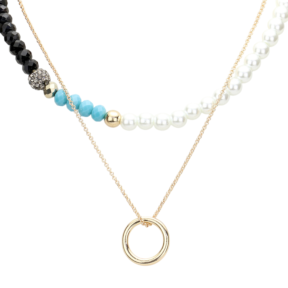 Natural Stone Pearl Metal Coin Stone Cluster Charm Station Double Layered Necklace
