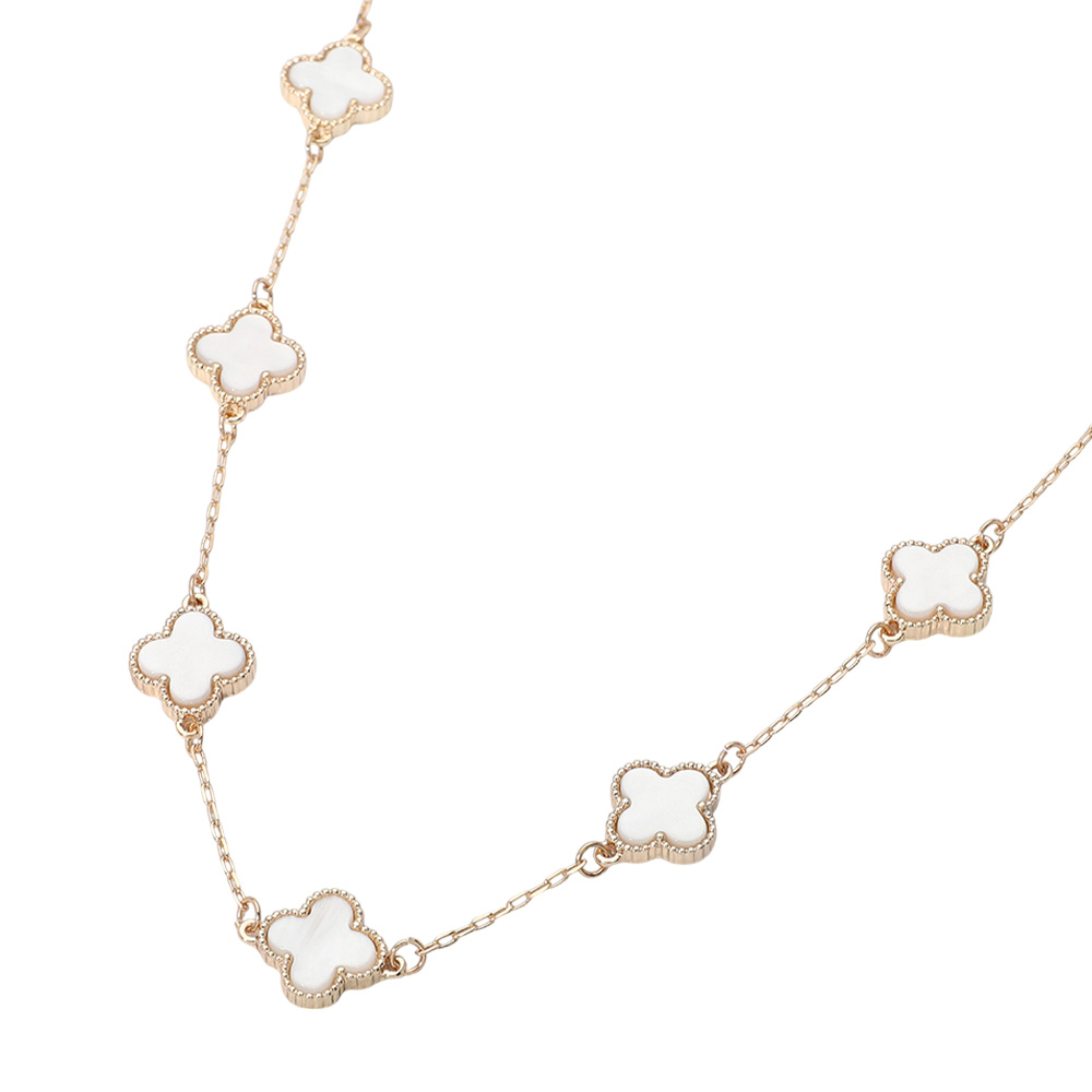 • An elegant quatrefoil charm station necklace crafted with a sleek, modern silhouette. Its repeating clover design adds a refined touch that elevates everyday outfits or special-occasion looks, offering a timeless accessory that blends effortlessly with any personal style.