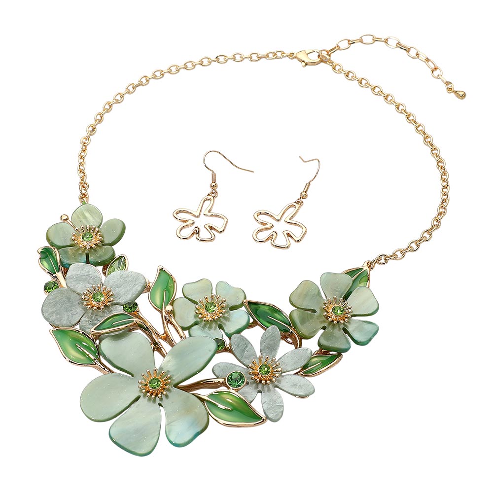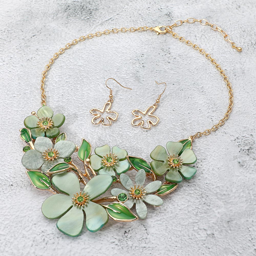 • This floral statement necklace and earring set showcases beautifully layered petals and delicate leaf accents, creating a bold yet elegant look. Perfect for special occasions or evening events, this coordinated set adds a sophisticated, feminine charm that enhances any ensemble.