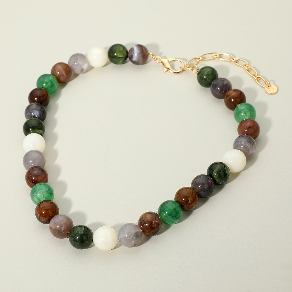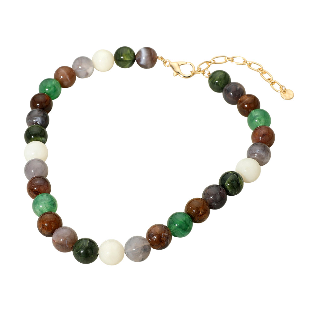 Details • Necklace Size : 17" + 3" L • Decor Size : 0.5" L • Add a touch of earthy elegance with this 17.5" round beaded necklace. Featuring polished natural stones in a variety of tones, each bead showcases unique patterns and depth. Finished with a secure clasp and extender, this versatile piece is perfect for layering or wearing solo. • Lead and Nickel Compliant