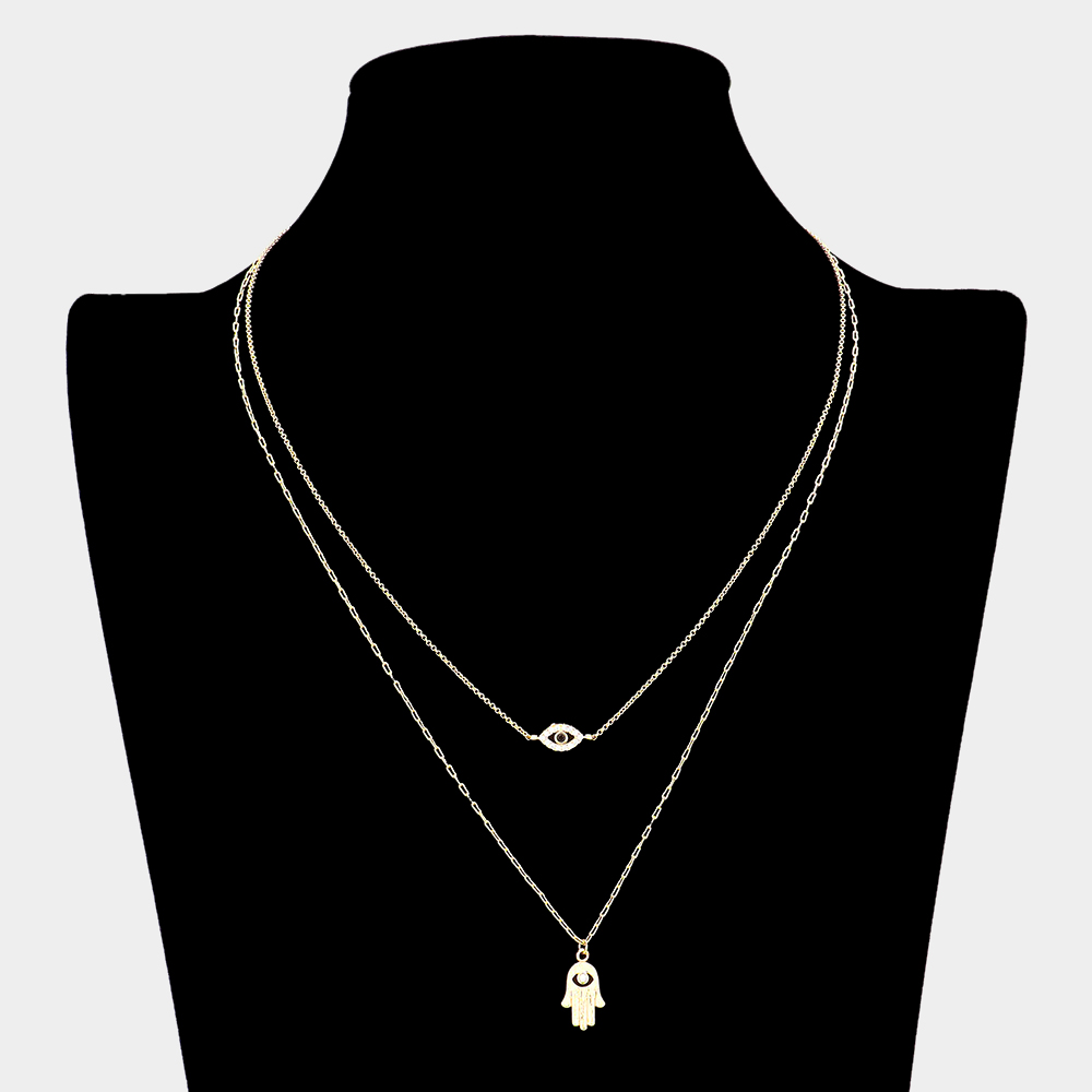 Details • Necklace Size : 16.5" + 2" L • Decor Size : 1.6" L • Pendant Size : 0.6" X 0.7", 0.3" X 0.25" • Layered necklace set featuring an evil eye pendant paired with a Hamsa pendant, both accented with sparkling CZ for a meaningful, stylish look. A symbolic duo perfect for daily wear, protection-inspired gifting, and effortless layering. • Gold Dipped • CZ Cubic Zirconia