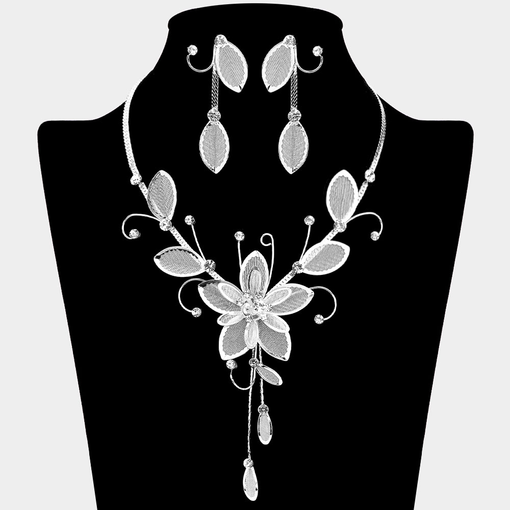 • Stunning floral statement necklace paired with matching drop earrings. Featuring intricate petal designs with sparkling accents, this elegant set is ideal for weddings, parties, and special occasions, adding sophistication and timeless charm to any outfit.