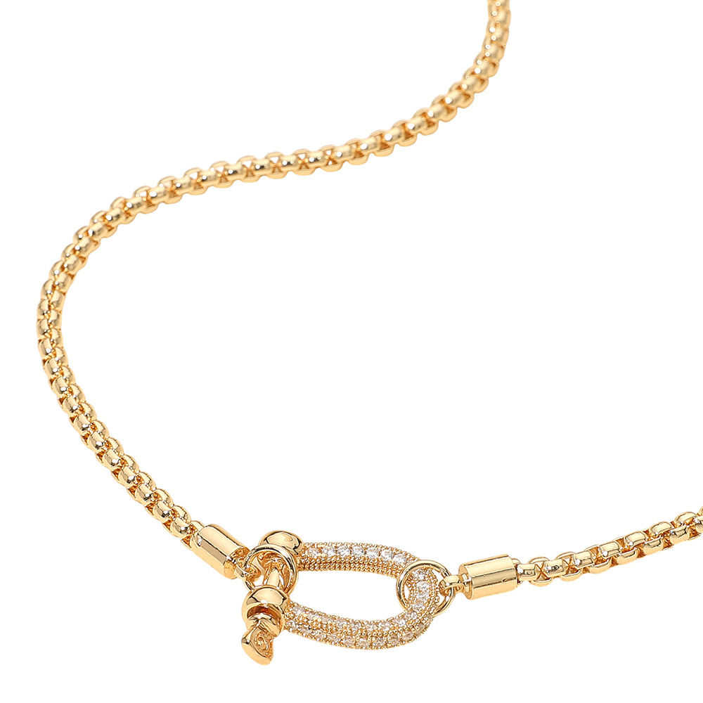 Details • Necklace Size : 16" + 3.5" L • Decor Size : 0.75" L • Elevate your style with this box chain necklace featuring a shimmering pave link carabiner pendant. Designed with a secure clasp and a bold, refined look, this statement piece adds elegance and sophistication to both everyday wear and special occasions. • Lead and Nickel Compliant