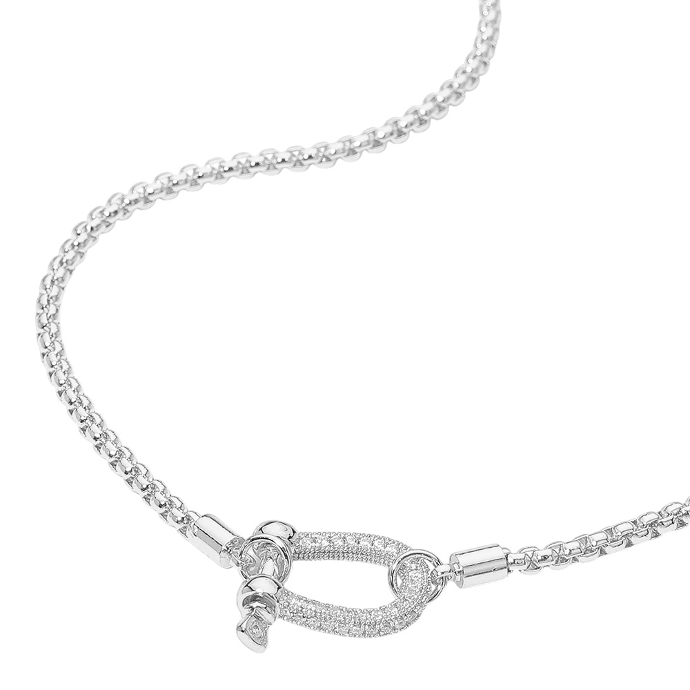 Details • Necklace Size : 16" + 3.5" L • Decor Size : 0.75" L • Elevate your style with this box chain necklace featuring a shimmering pave link carabiner pendant. Designed with a secure clasp and a bold, refined look, this statement piece adds elegance and sophistication to both everyday wear and special occasions. • Lead and Nickel Compliant