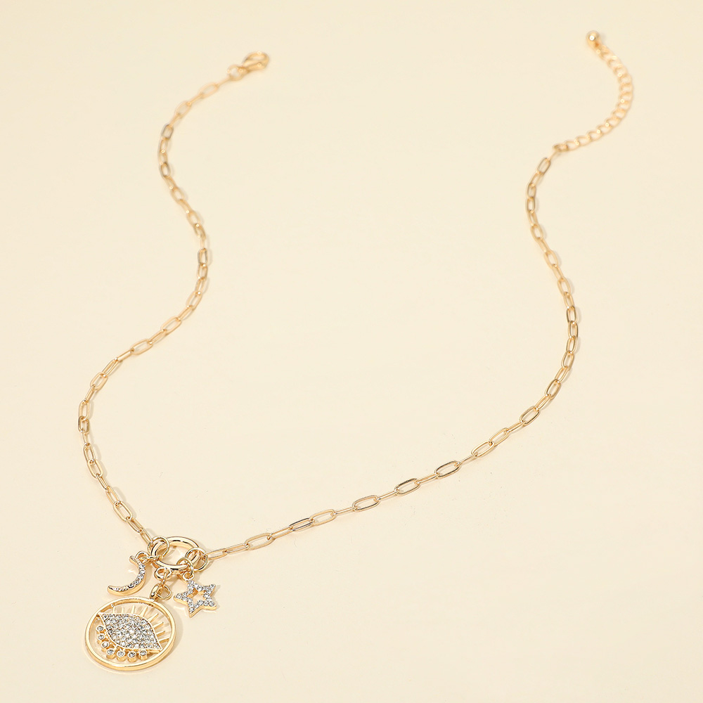 Details • Necklace Size : 17" + 2.5" L • Decor Size : 1.75" L • Add a touch of celestial elegance with this charm necklace featuring moon, star, and eye pendants adorned with sparkling stones. Perfect for layering or wearing solo, this piece blends modern style with symbolic beauty, making it ideal for both everyday wear and special occasions. • Lead and Nickel Compliant