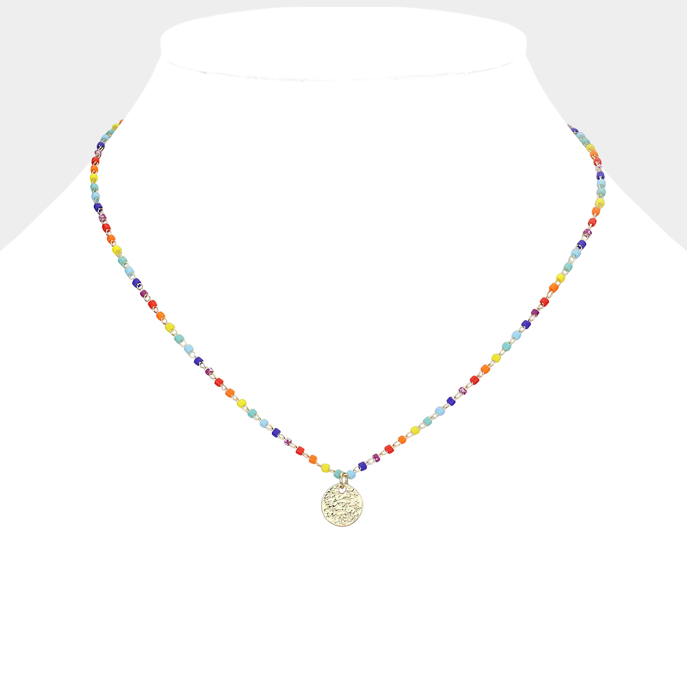 Textured Metal Disc Pendant Tiny Bead Link Necklace