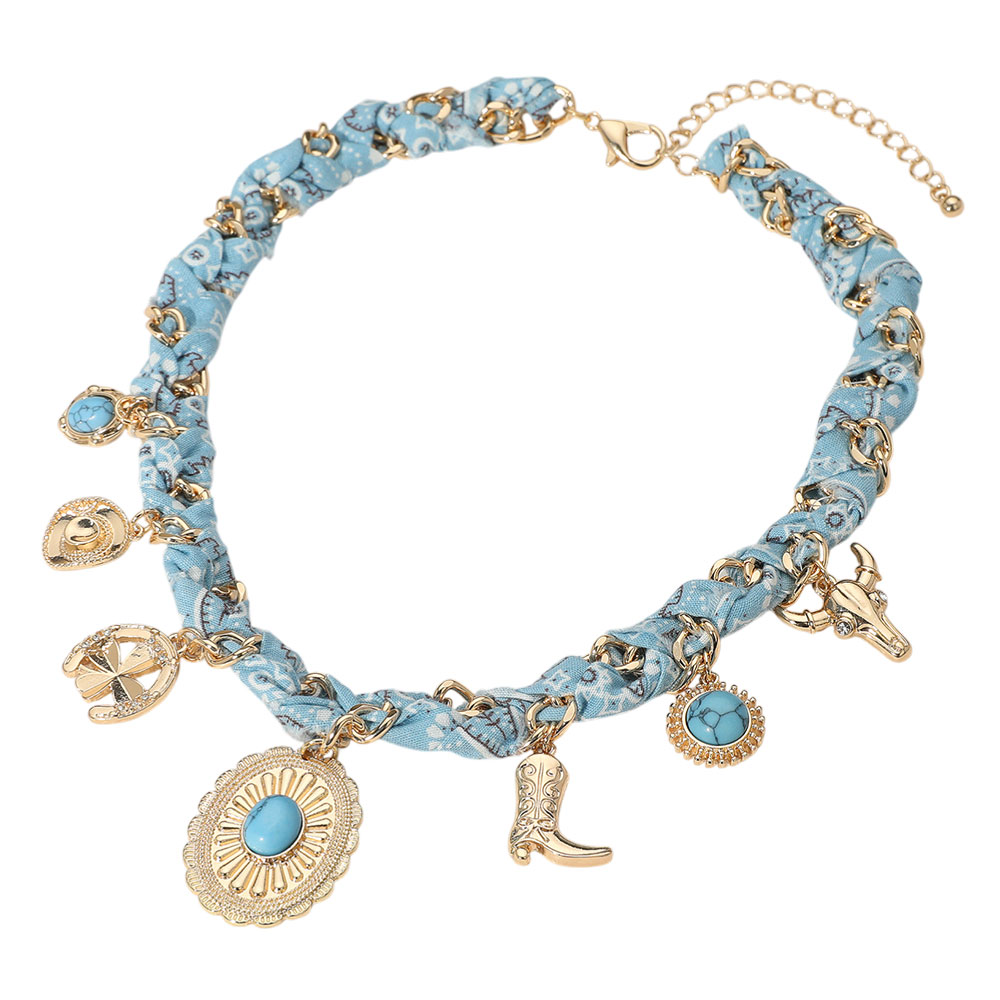Details • Necklace Size : 17" + 3.25" L • Decor Size : 1.5" L • Channel rustic charm with this western-inspired necklace featuring a fabric-wrapped band and detailed gold pendants like boots, hats, and horseshoes. Accented with textured medallions and a steer head charm, it’s perfect for cowgirl flair. Adjustable fit for layered or solo styling. • Lead and Nickel Compliant