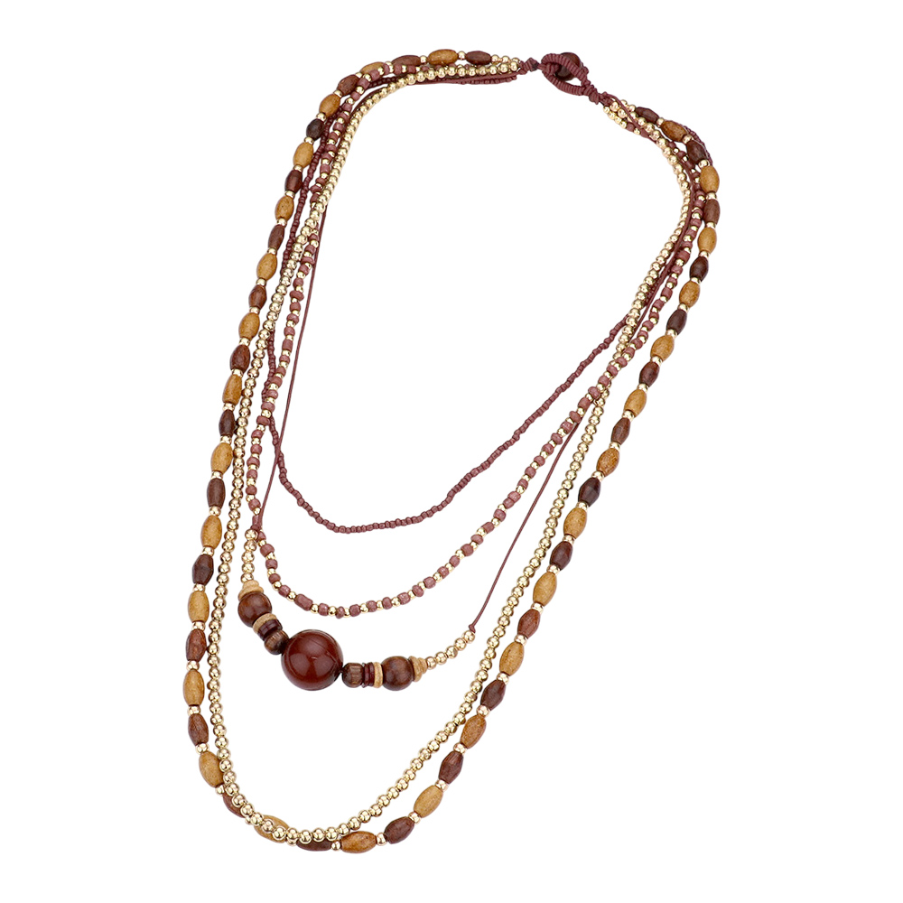 Wood Beaded Hammered Circle Medal Toggle Necklace